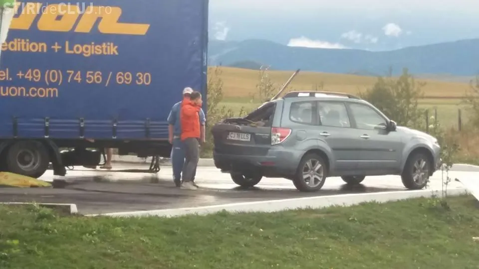 ”Devastare facuta de tornada azi in Huedin. Acoperisul benzinariei Mol a fost smuls; o remorca de tir a fost luata pe sus si impinsa pe un SUV. Orasul a ramas fara curent”, relatează Cluj Actual.