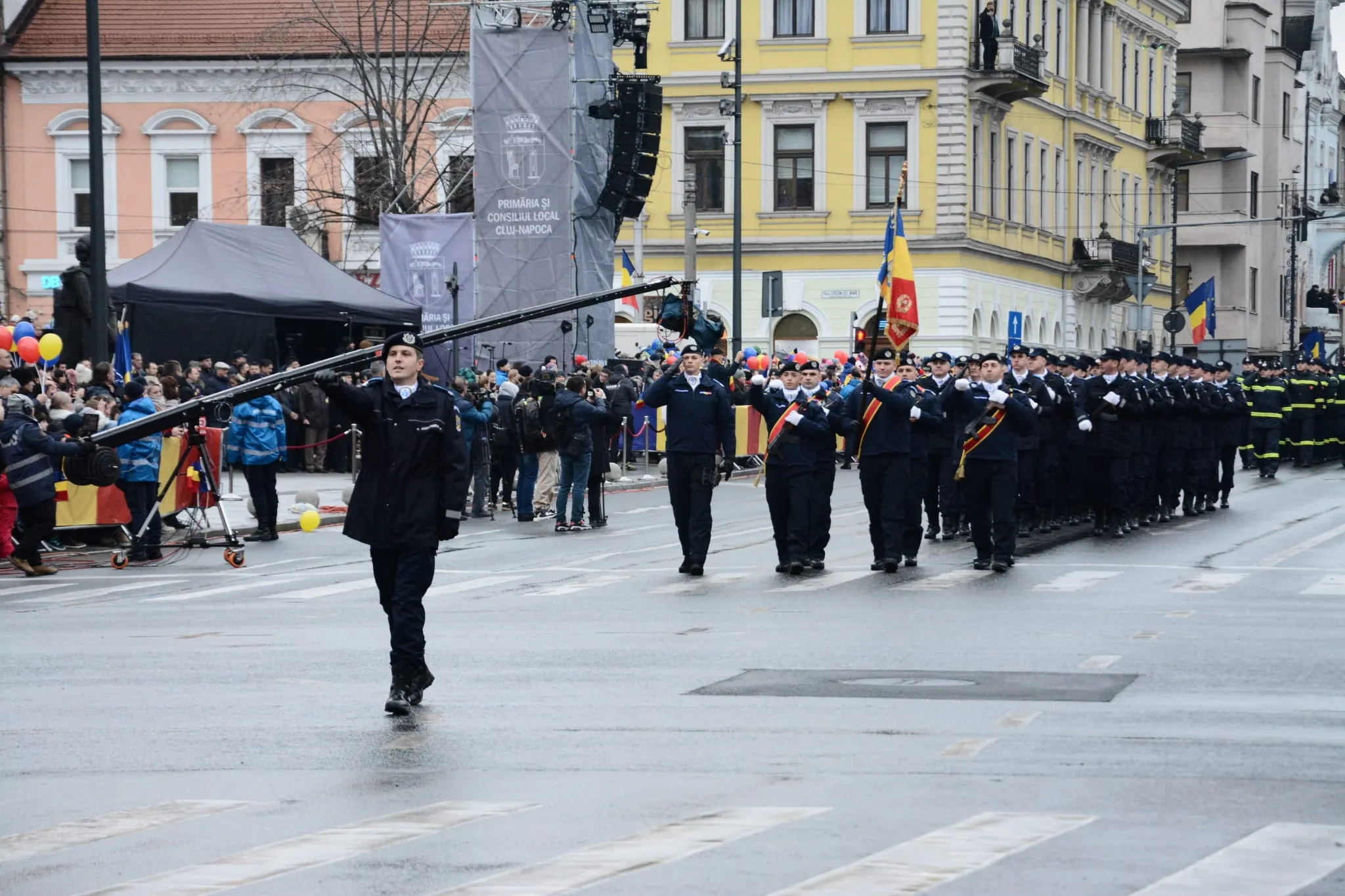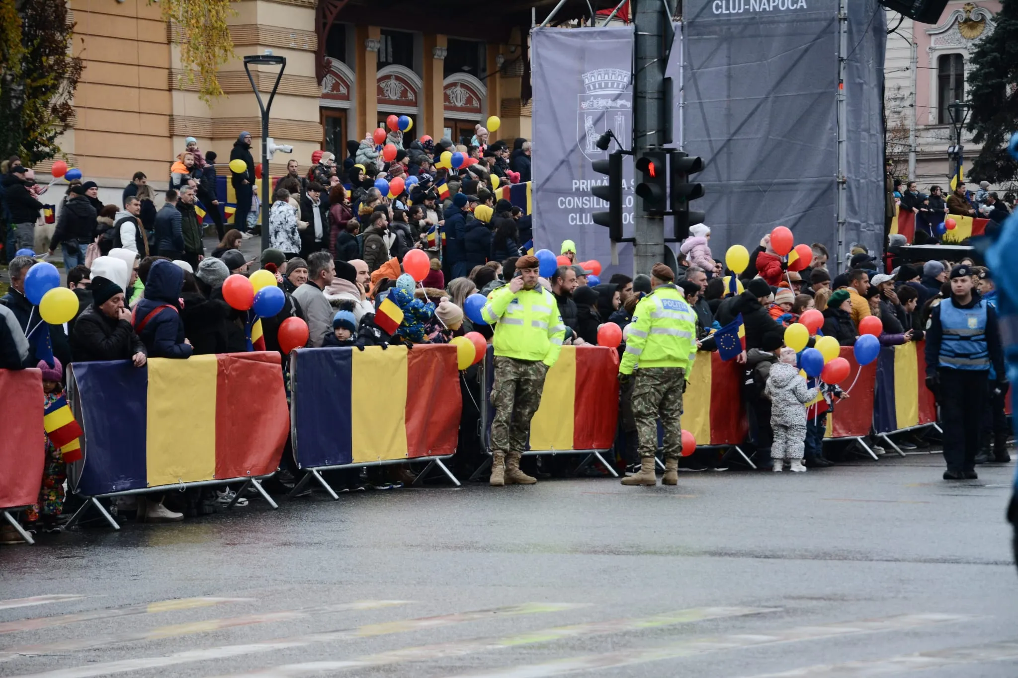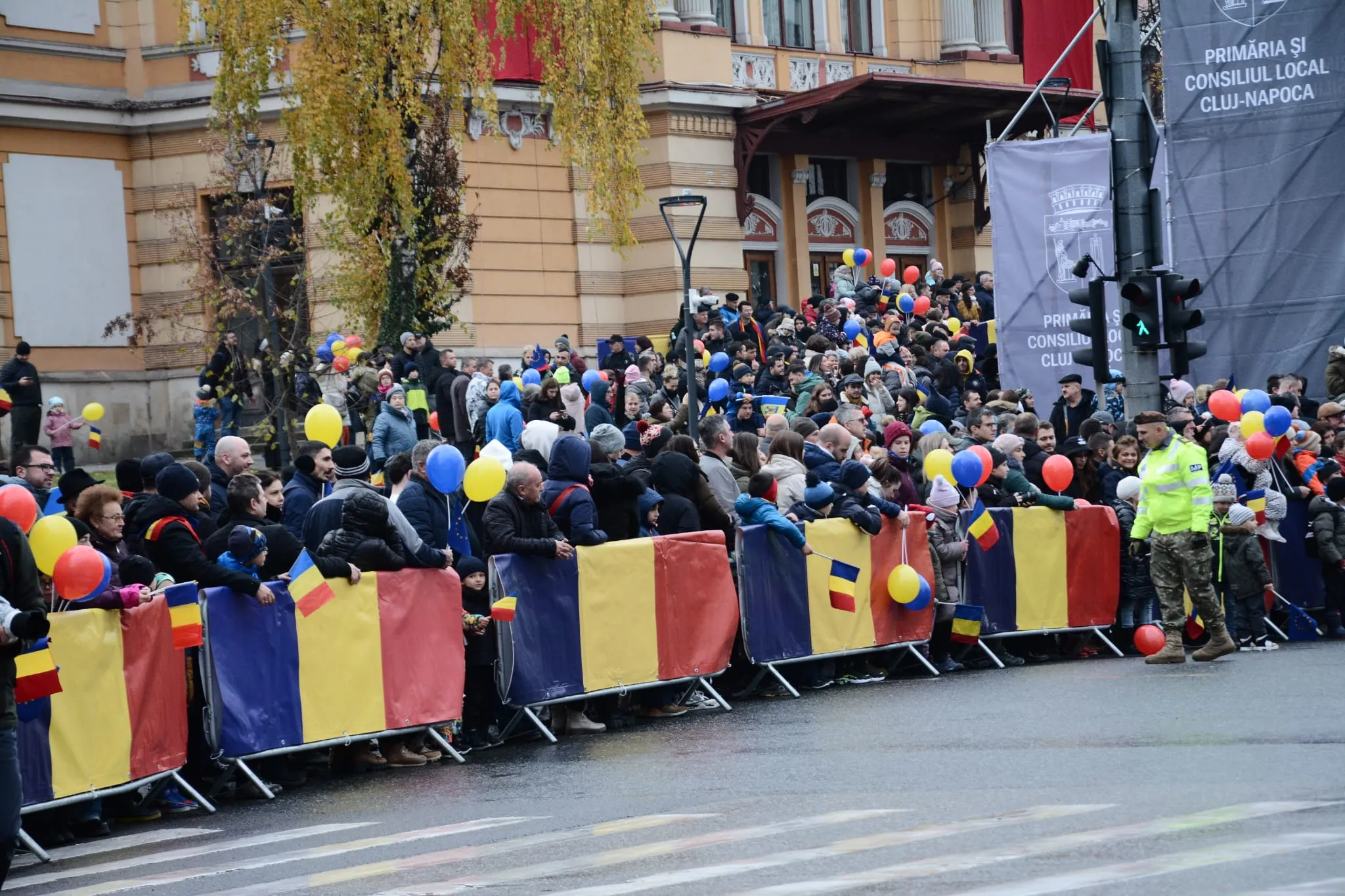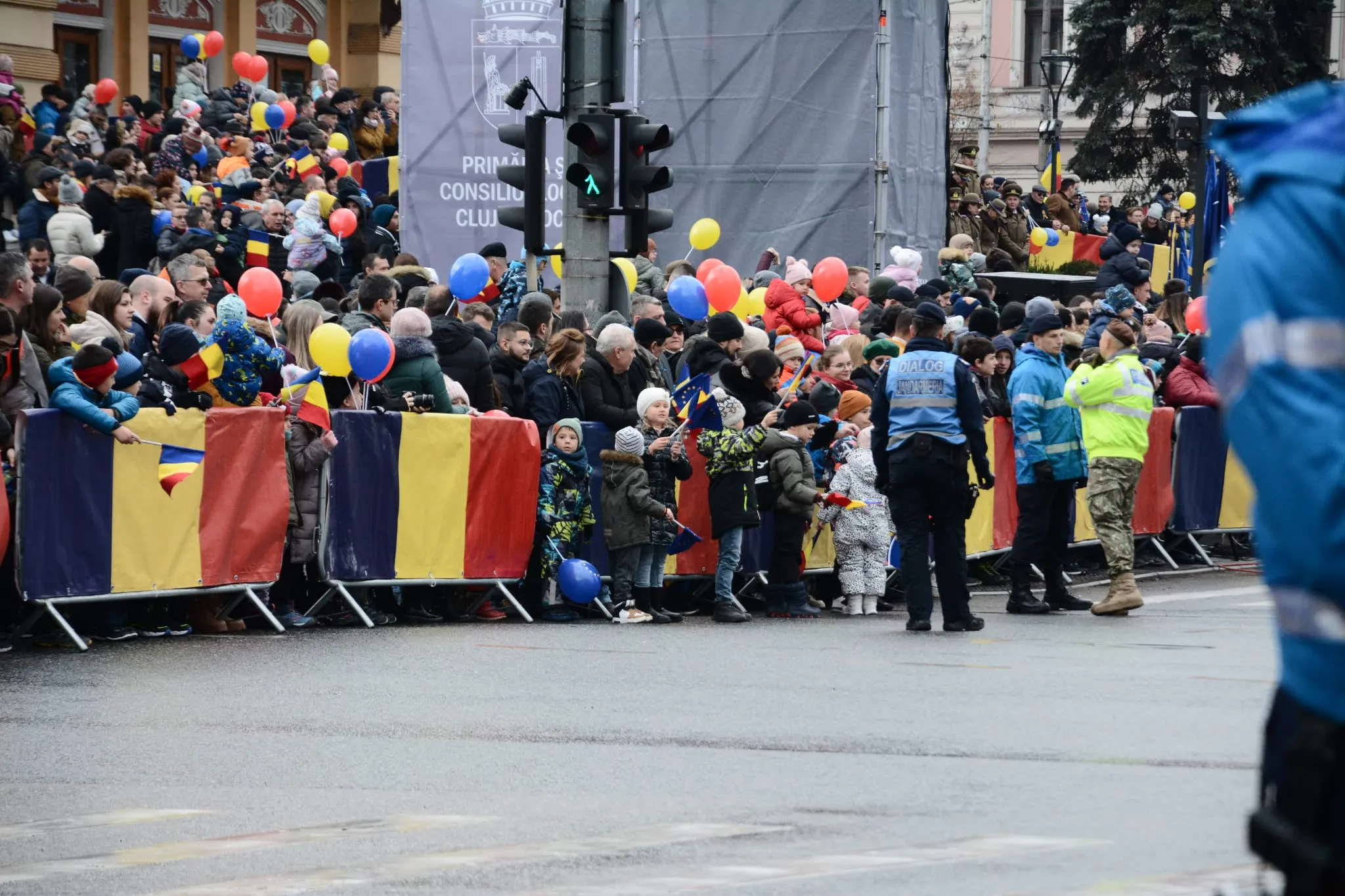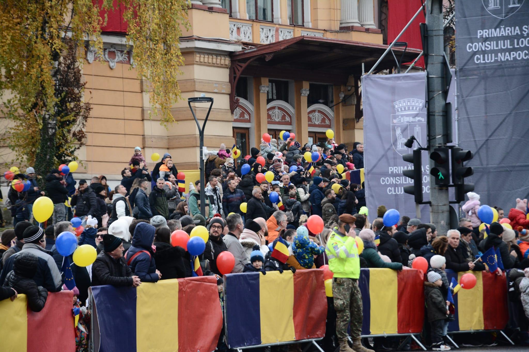 Sute de clujeni au asistat la parada de 1 Decembrie, din Piața Avram Iancu. Au fost foarte mulți copii care s-au înghesuit în primele rânduri pentru a saluta soldații, jandarmii, polițiștii și pompierii, care au defilat.