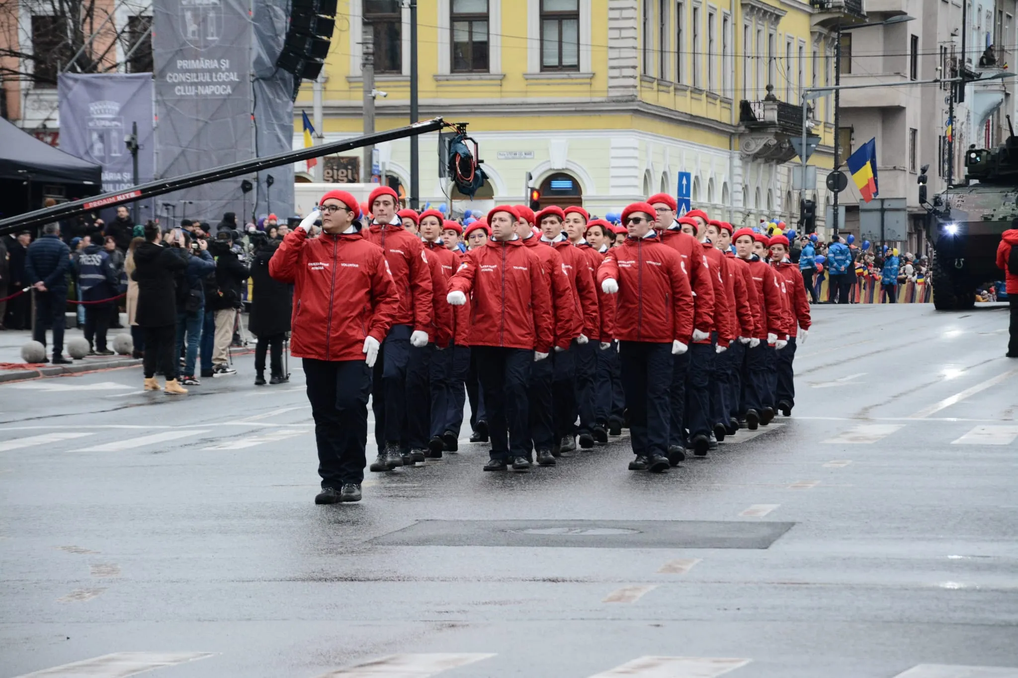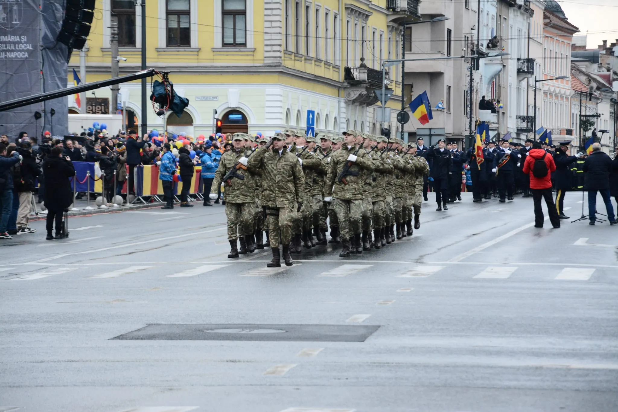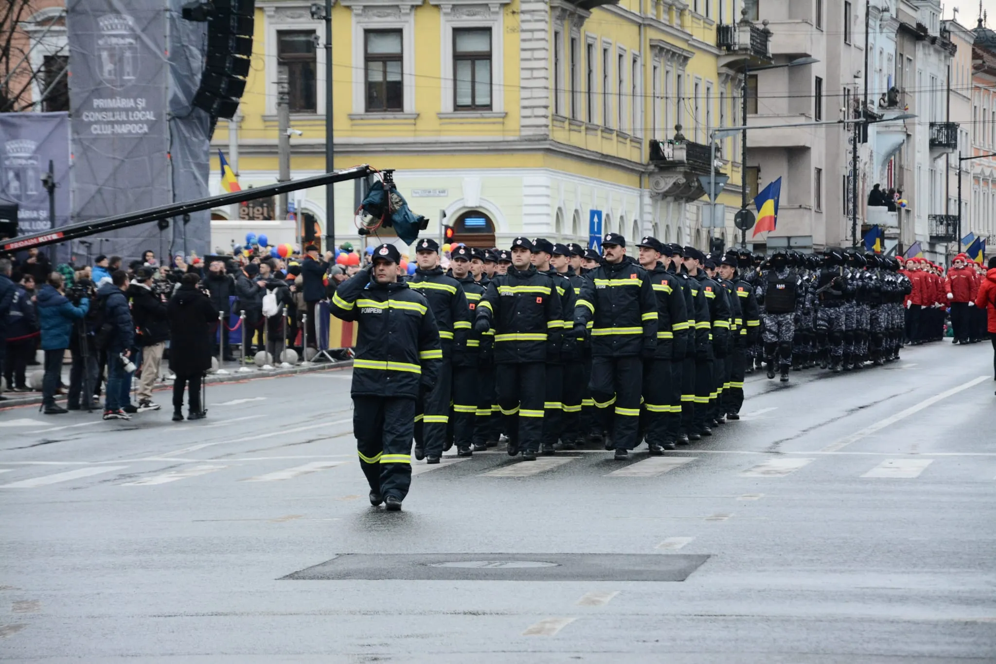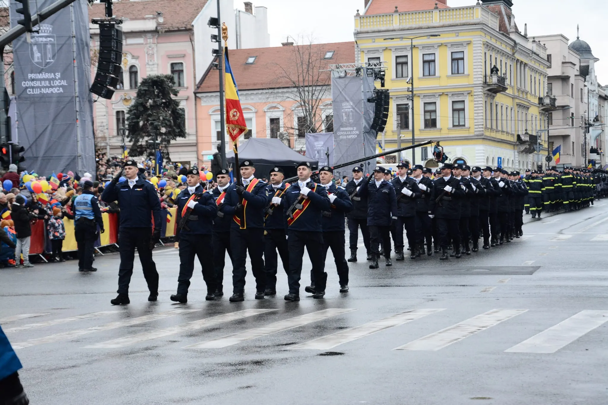 Sute de clujeni au asistat la parada de 1 Decembrie, din Piața Avram Iancu. Au fost foarte mulți copii care s-au înghesuit în primele rânduri pentru a saluta soldații, jandarmii, polițiștii și pompierii, care au defilat.