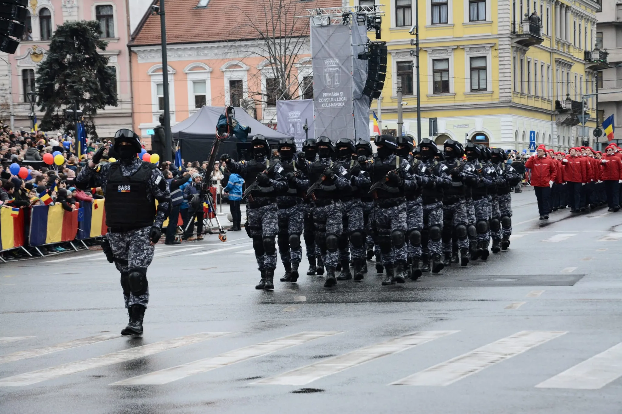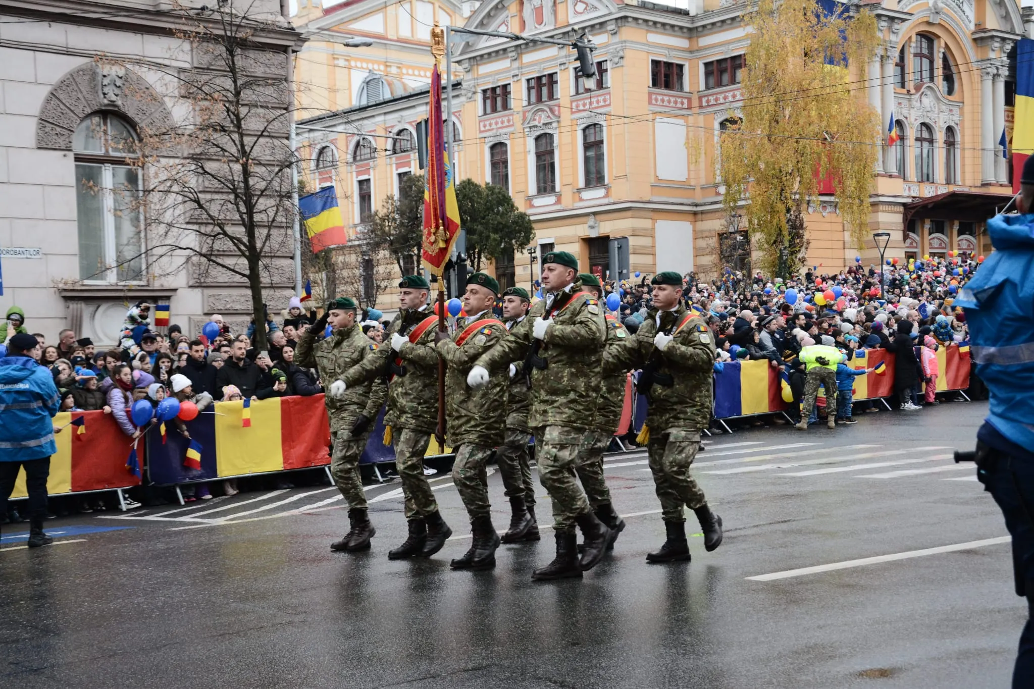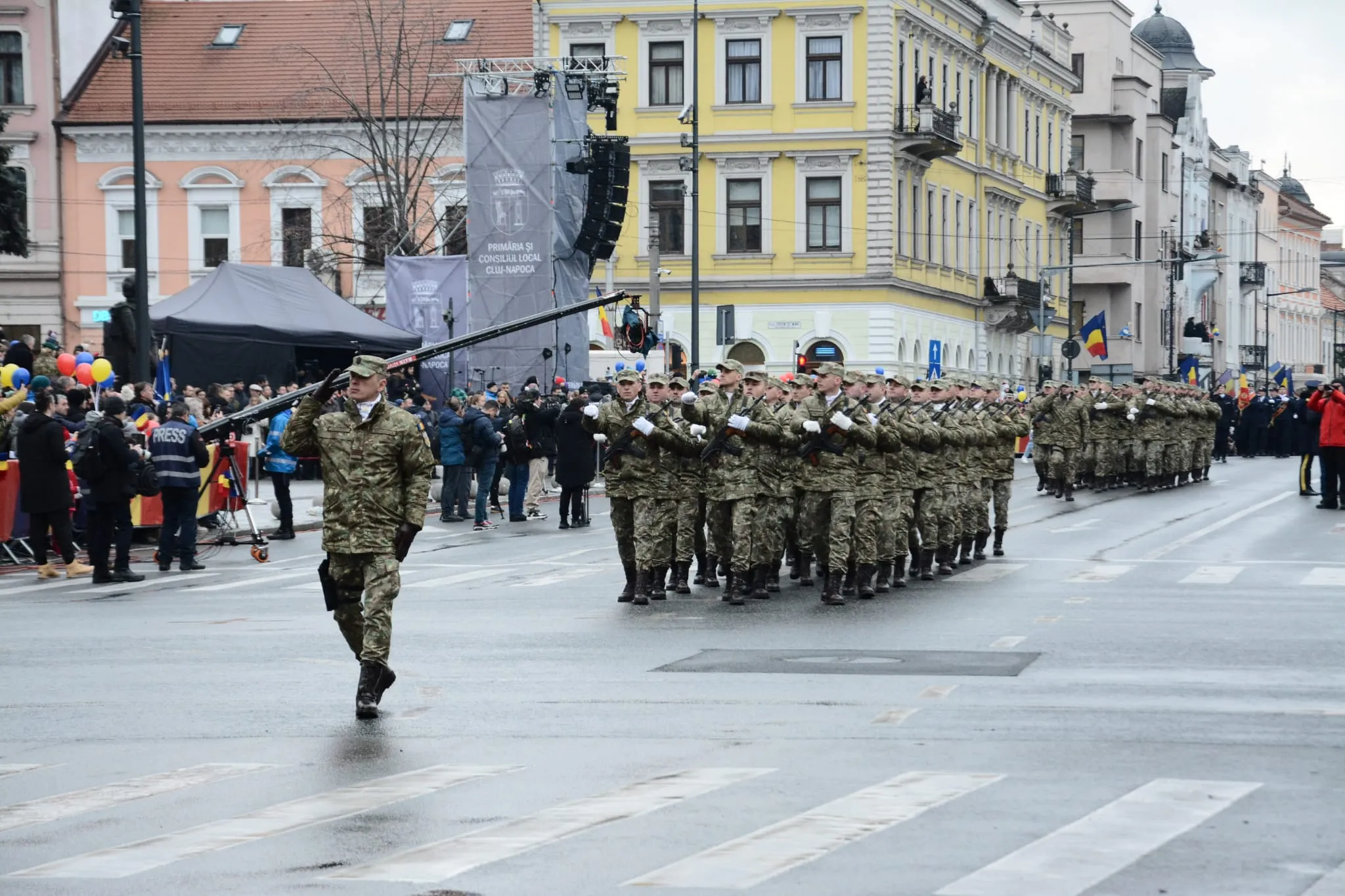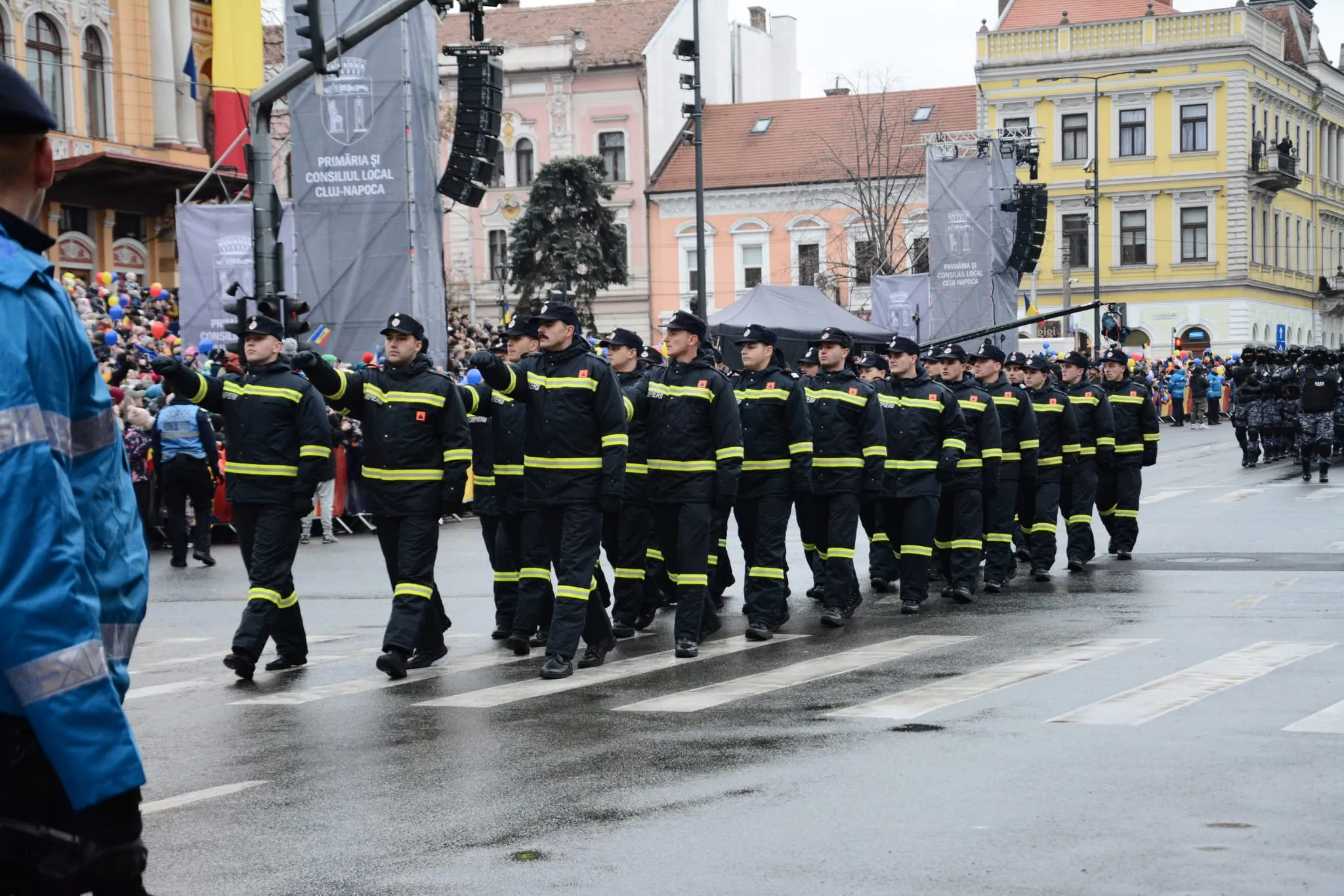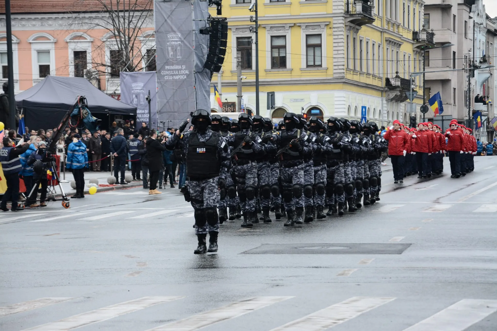 Sute de clujeni au asistat la parada de 1 Decembrie, din Piața Avram Iancu. Au fost foarte mulți copii care s-au înghesuit în primele rânduri pentru a saluta soldații, jandarmii, polițiștii și pompierii, care au defilat.
