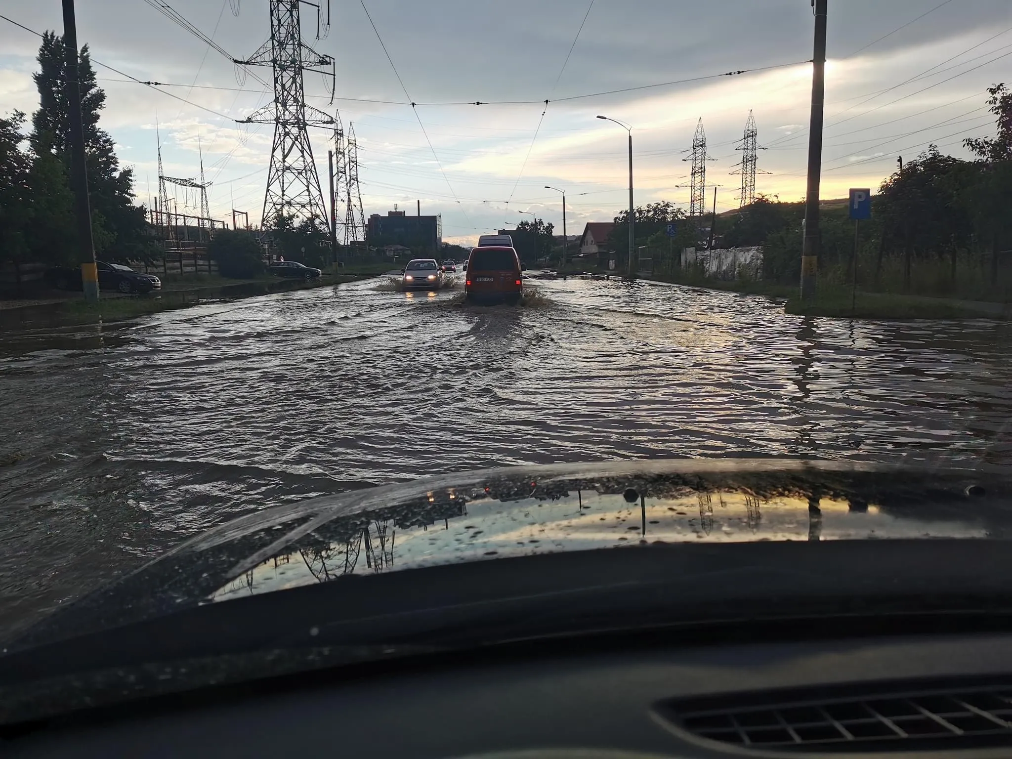 Mașinile au înaintat cu greu prin apa care acoperea drumul. Canalizarea nu a făcut fata, semn ca a fost gândită prost.