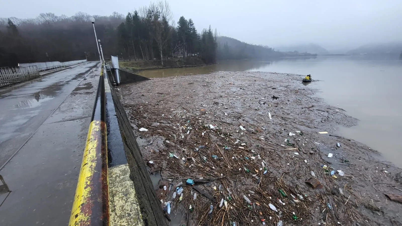Lacul de la Gilău e plin de gunoaie și material lemnos din depozitele ilegale. Viitura le-a adus de pe munte - FOTO