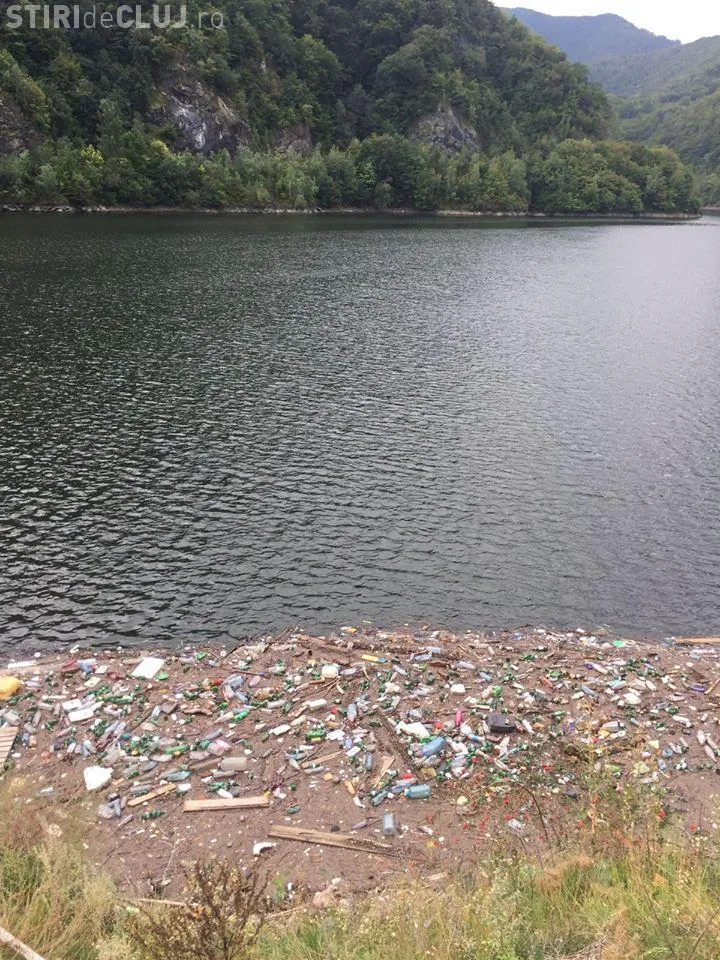 În fotografie se văd sticle, cel mai probabil de bere, de la petrecerile care se dau la cabanele de pe malul lacului sau care sunt aruncate pur și simplu de așa-zișii ”turiști” care stau la aer liber pe malul magnificului lac.