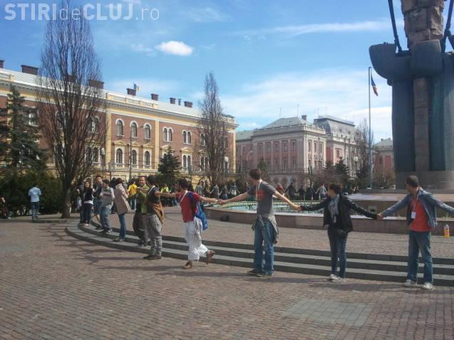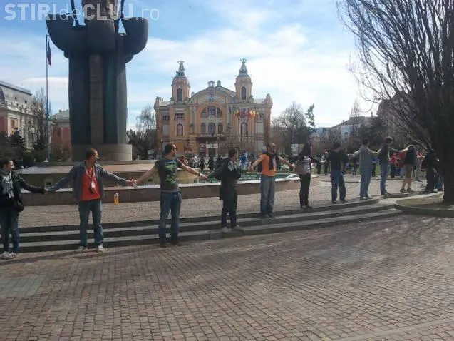 Studentii ERASMUS din mai multe tari s-au adunat la Cluj-Napoca in perioada 6 - 8 aprilie. Sambata, la ora 14.30, circa 100 de tineri au format un lant umanitar in Piata Avram Iancu.