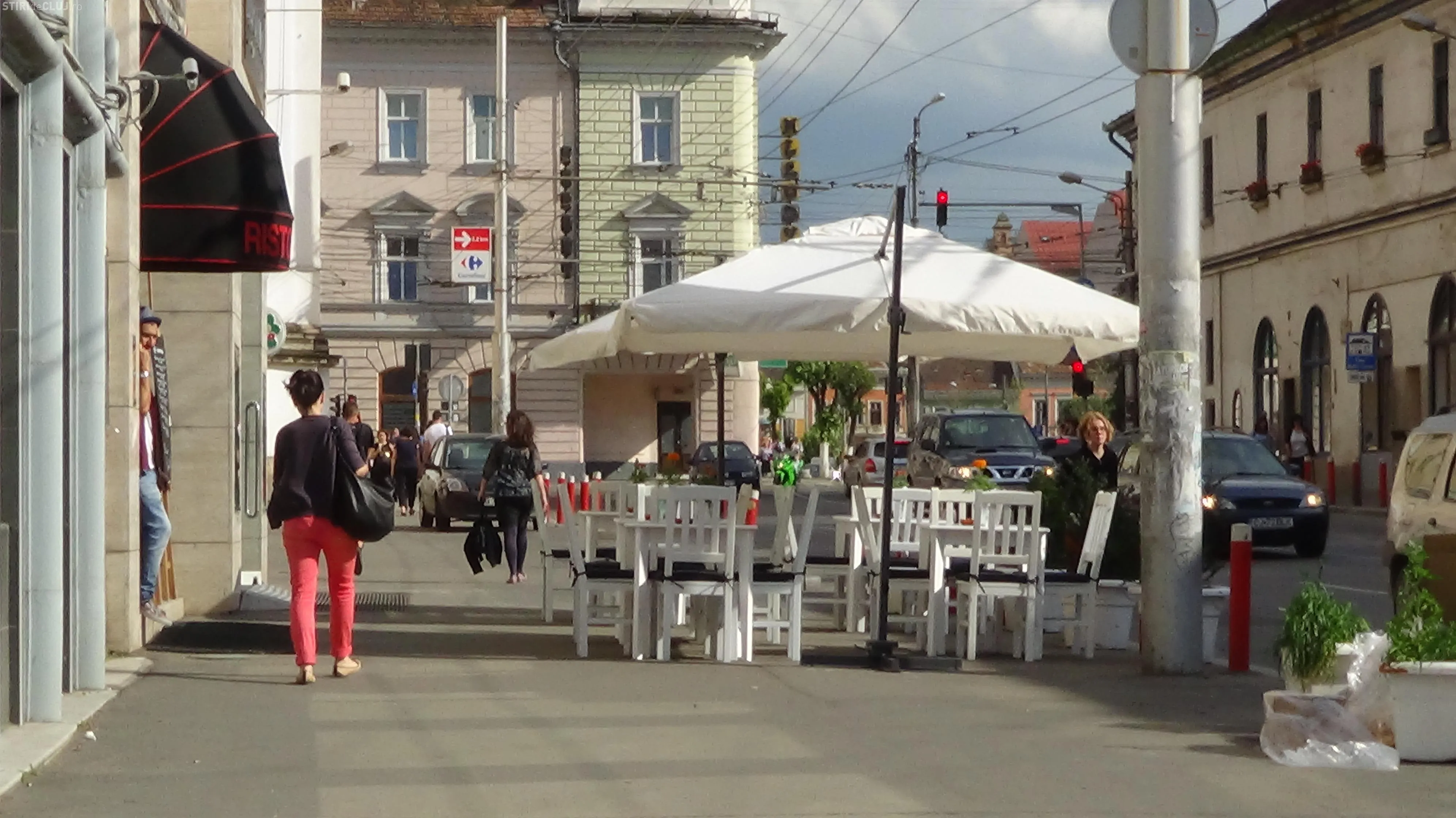 Terasa ocupă o bună bucată din trotuar, fiind lăsat un loc pentru trecerea pietonilor.