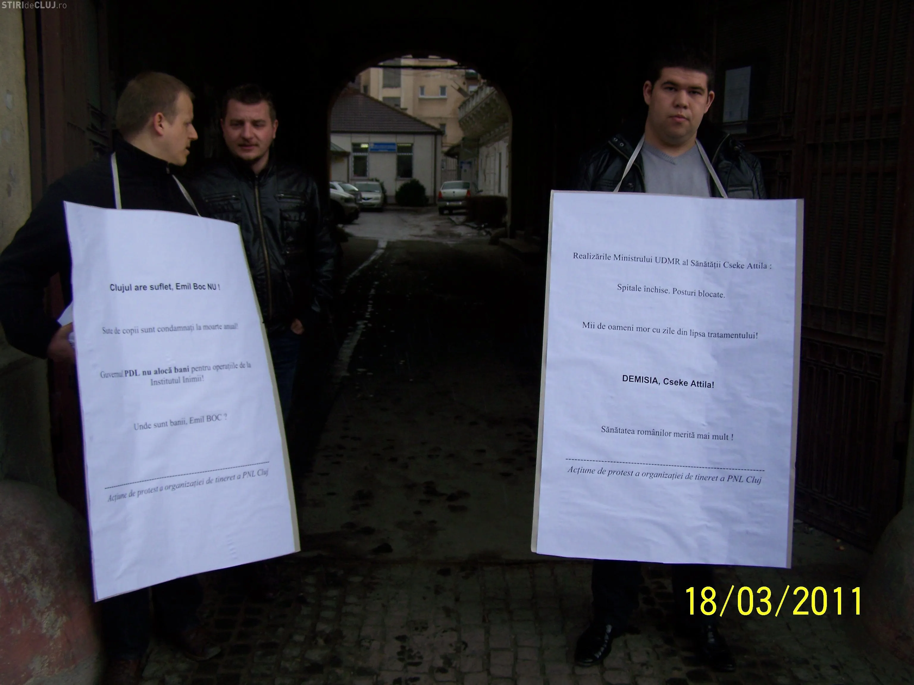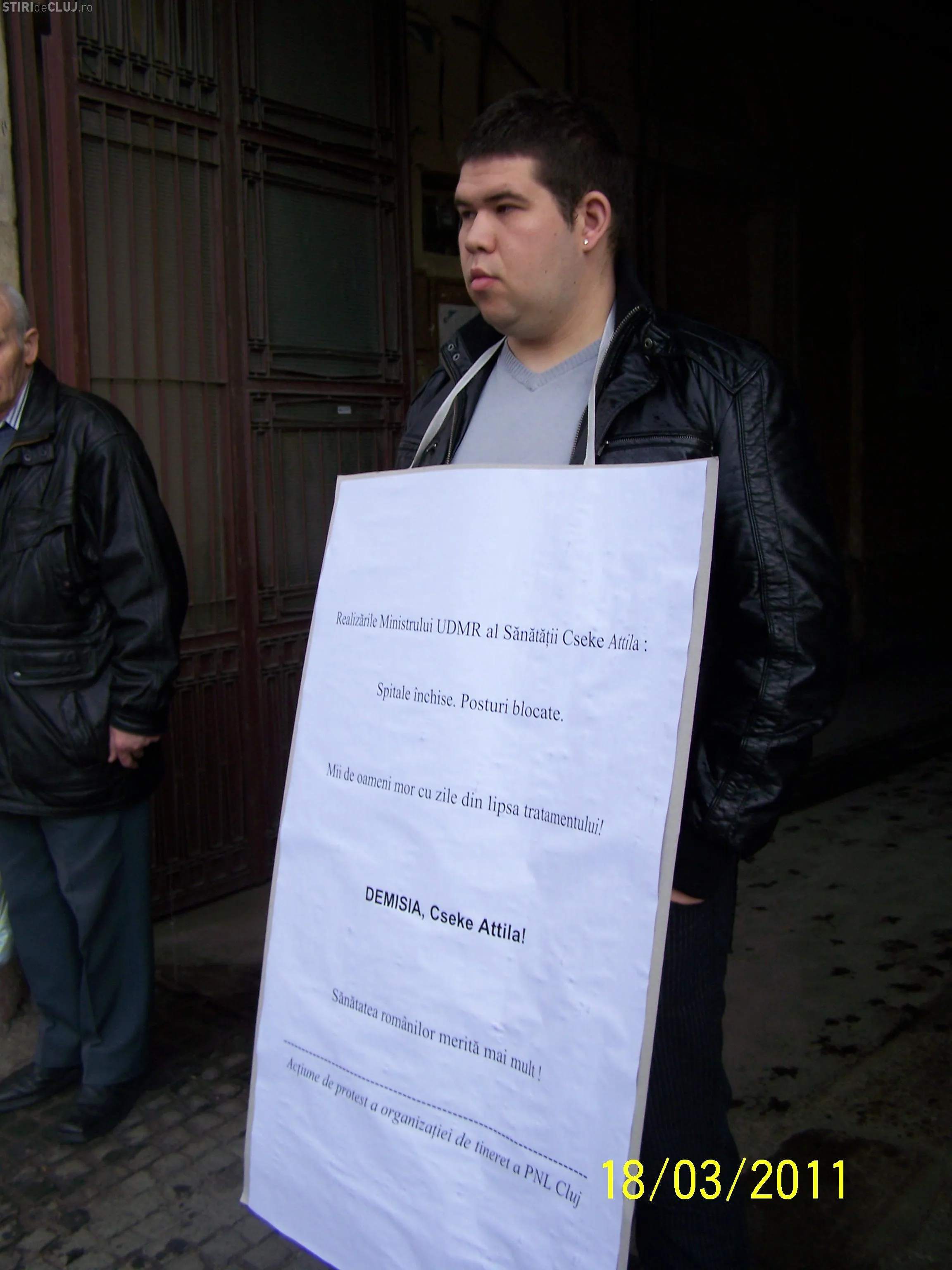 Doi tineri liberali au protestat in fata sediul PDL Cluj si au avut legate de gat doua pancarte. Ei au impartit si fluturasi clujenilor.
