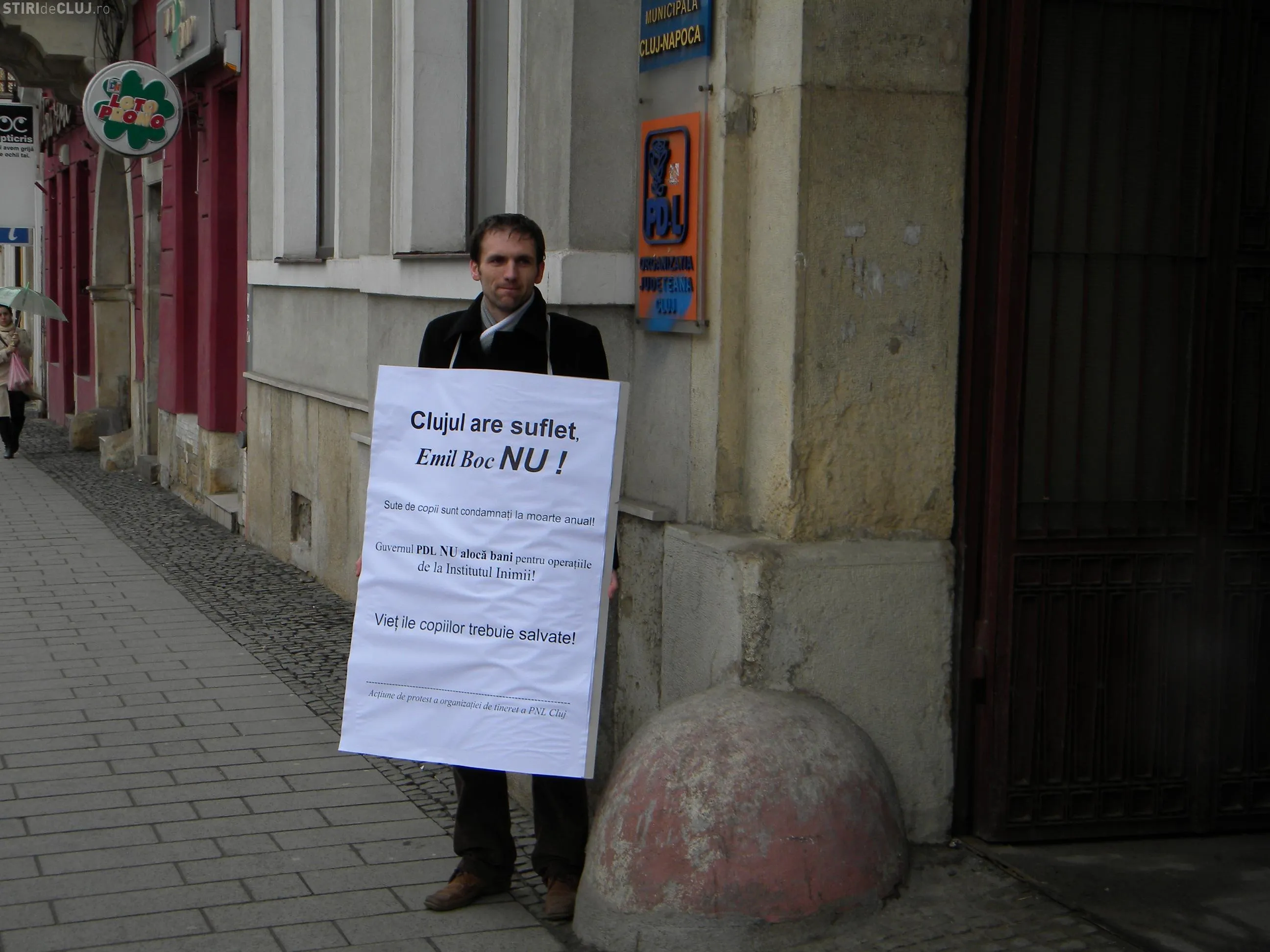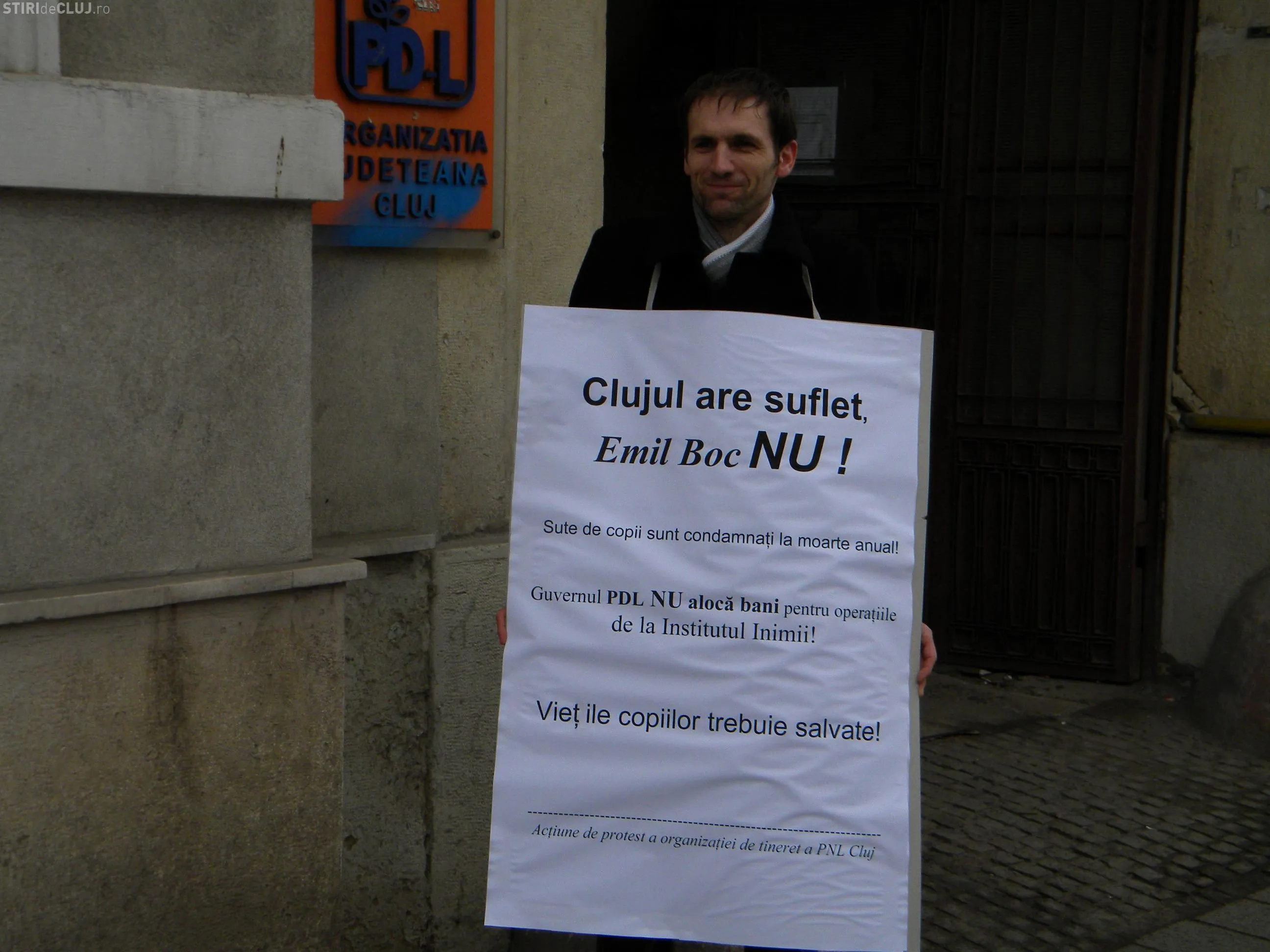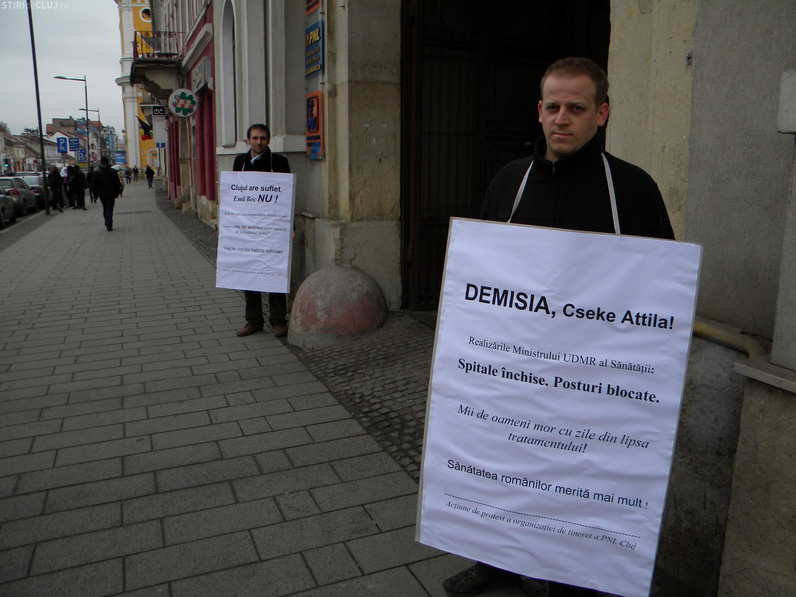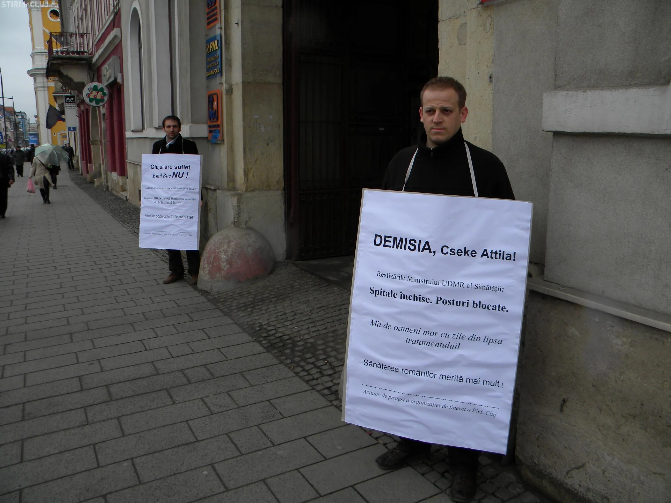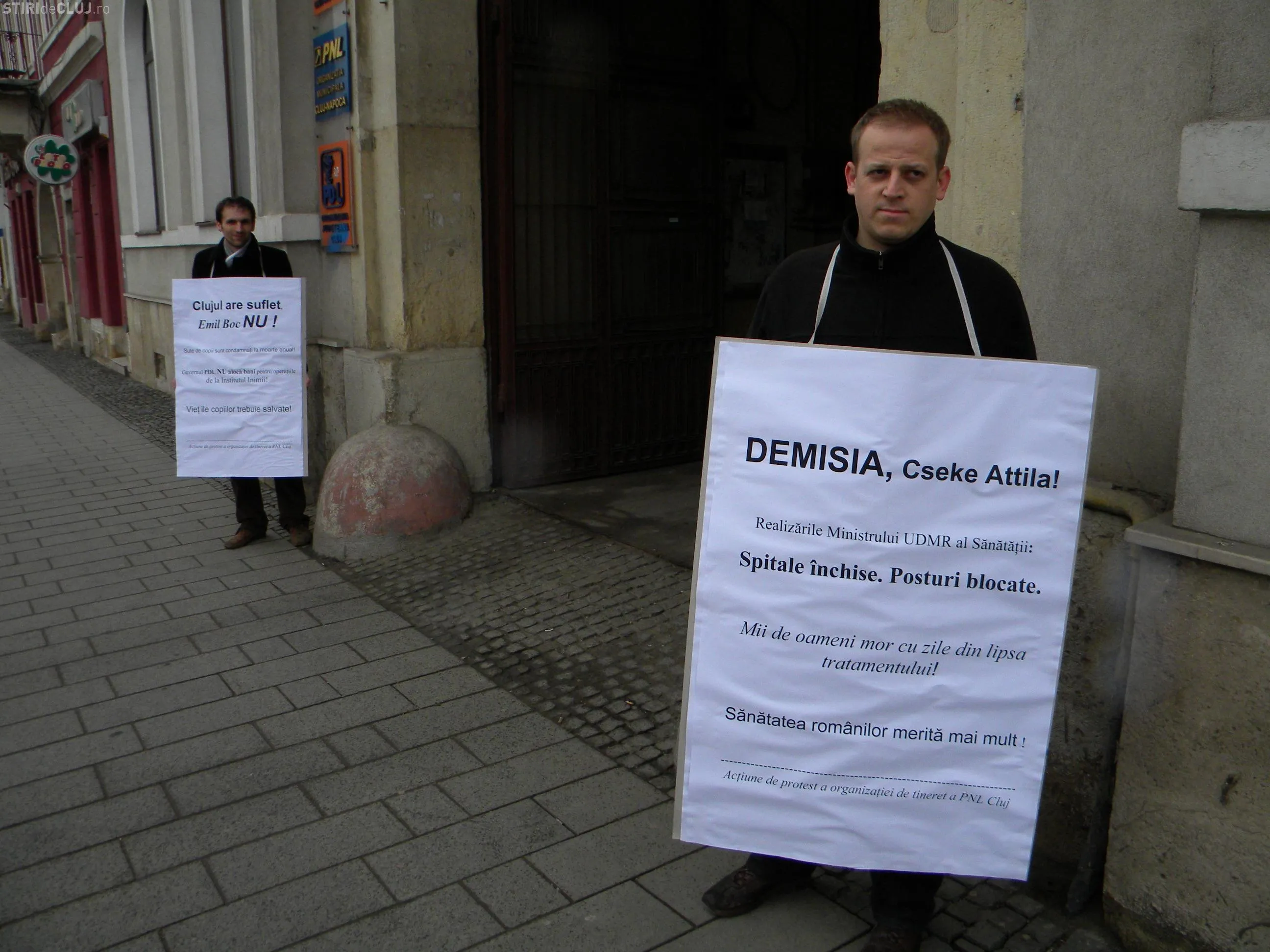Cei doi tineri liberali din Cluj au protestat si sambata, 19 martie, in fata sediului PDL vis-a-vis de situatia financiara critica de la Institutul Inimii Cluj.