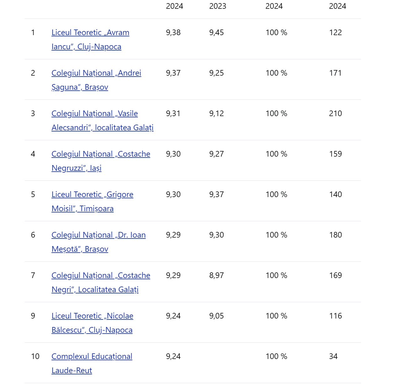 Este important de menționat că topul de mai jos, se referă doar la liceele care au avut peste 30 de candidați înscriși. Sursa date BACplus.ro