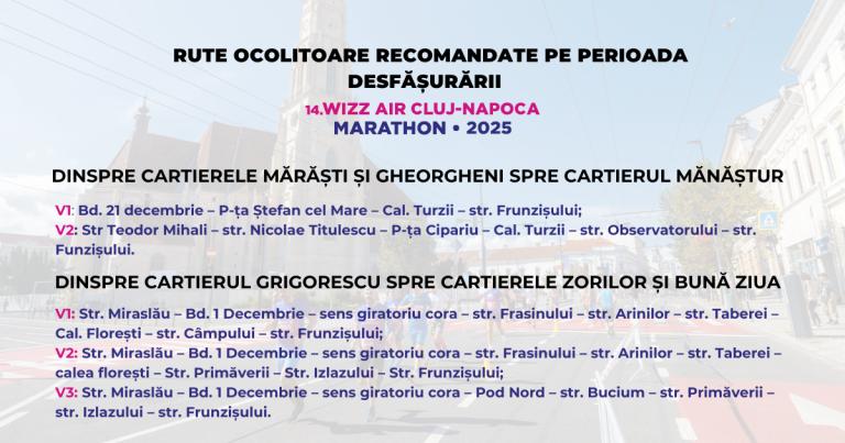Mai multe mijloace de transport în comun din Cluj-Napoca vor avea un traseu deviat duminică, 6 aprilie, cu ocazia maratonului Wizz Air Cluj-Napoca.