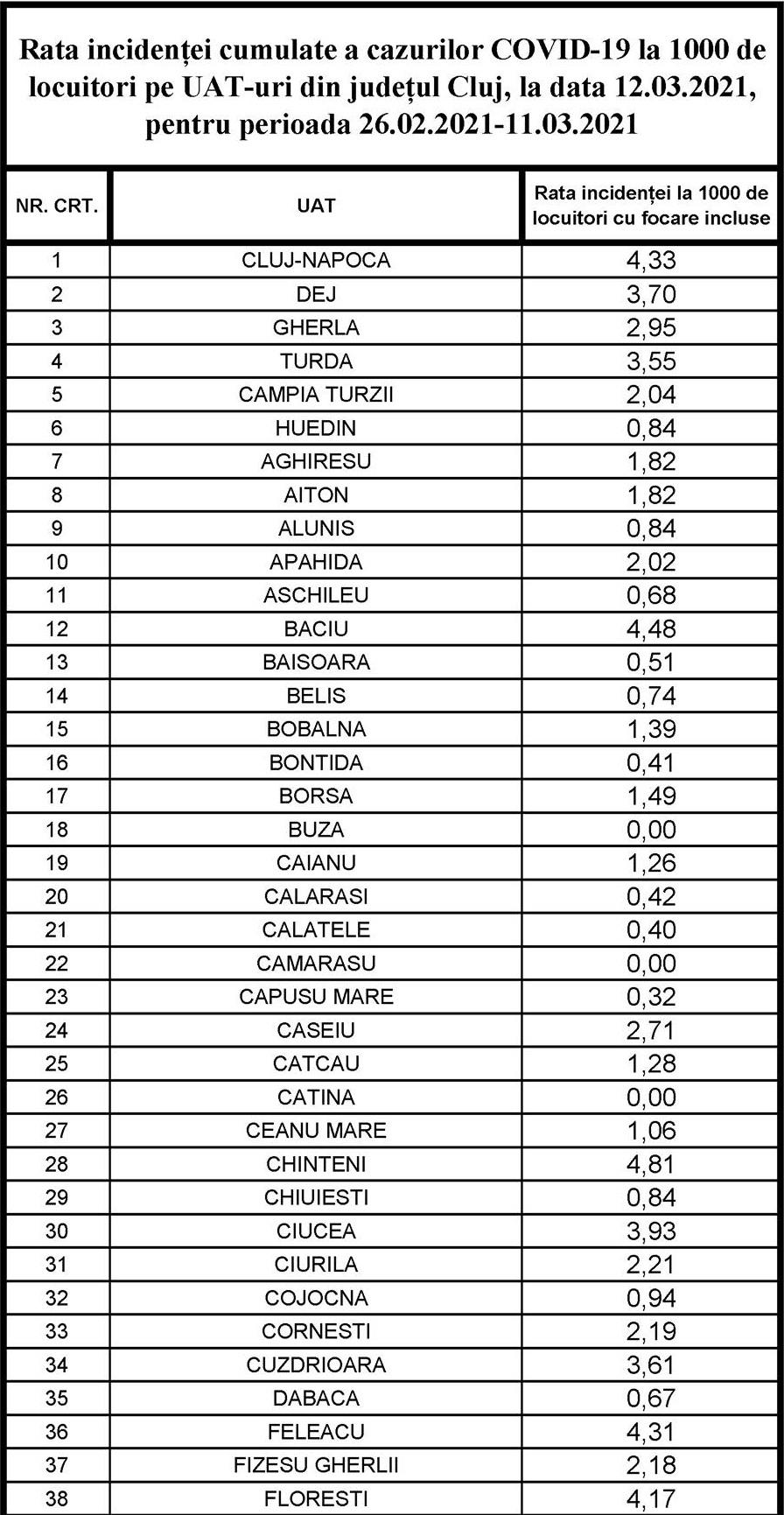 Comunele Florești, Feleacu și Chinteni se ridică la nivelul municipiului Cluj-Napoca, având și ele rata de infectare de peste 4 la mie. Care este situația în restul localităților?