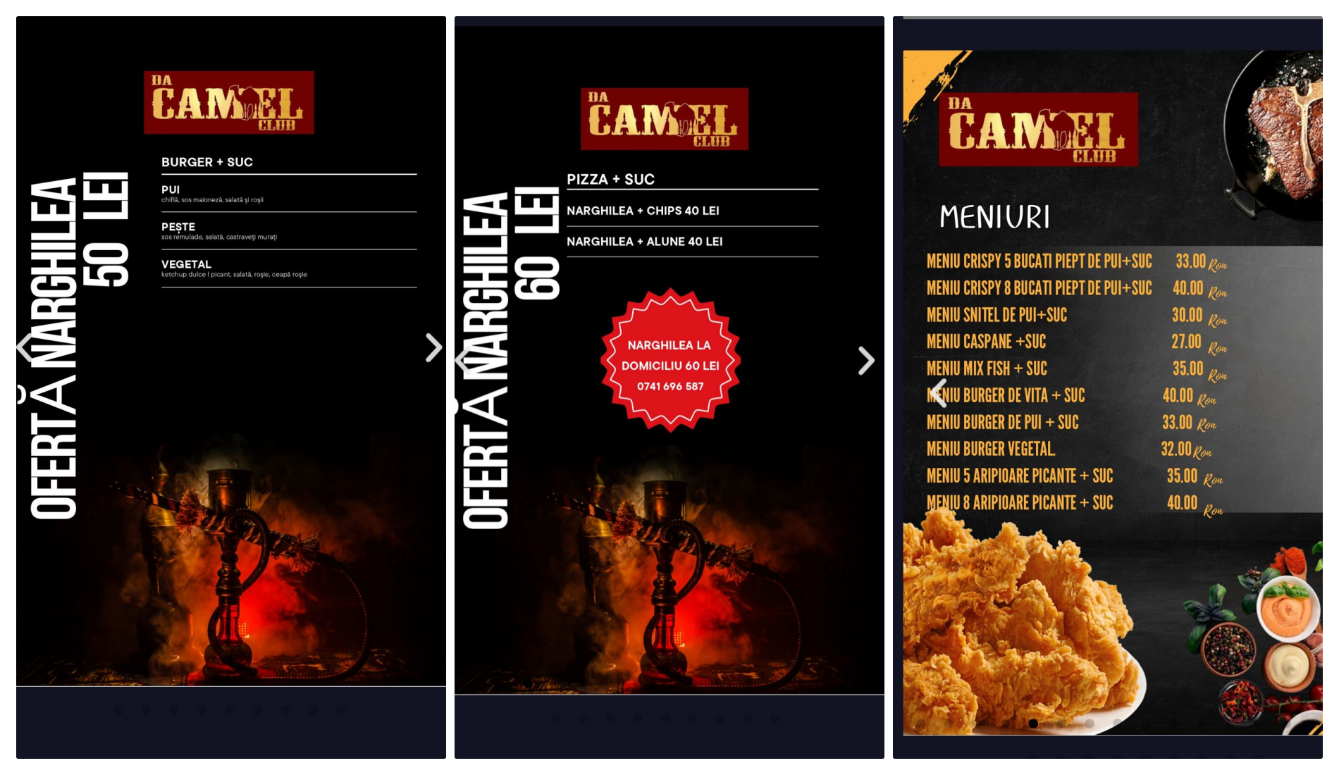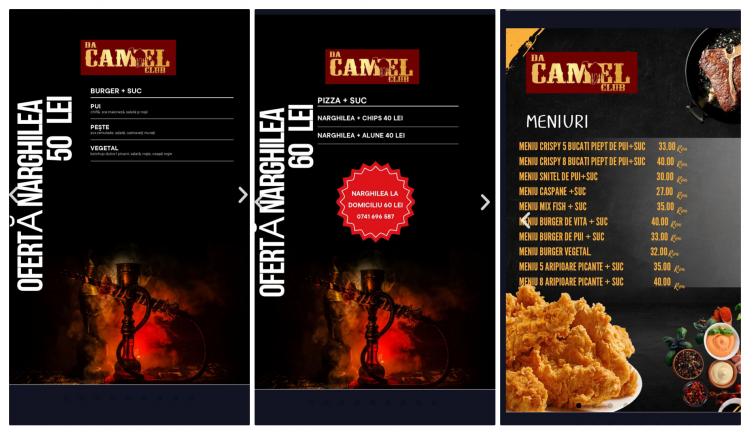 Și chiar așa e. Spre exemplu, dacă vrei să fumezi o narghilea, prețul este de 30 de lei, cel mai mic din tot Ardealul (în orice local din Cluj-Napoca costul începe de 60 de lei). Dacă vrei să și mănânci ceva, un burger cu suc și narghilea (sucul poate fi înlocuit cu apă sau bere, totul fiind negociabil), costă 50 de lei. Unde mai găsești așa ceva în oraș??? O narghilea cu o pizza mare, plus un suc (la fel poate fi înlocuită cu bere), costă 60 de lei. Cred că asta spune tot! Și nu începeți cu ”Păi cine știe ce pizza e!” până nu mergeți să vedeți. Oriunde în Clujul nostru o pizza costă cel puțin 50 de lei, iar la Da Camel Club prețul este de 40 de lei.