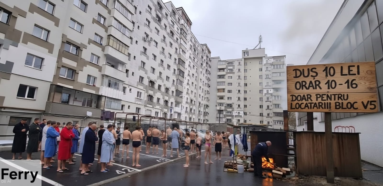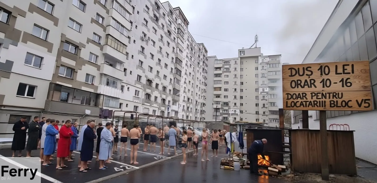 Pe grupul de bloc, oamenii și-au găsit refugiu în glume și imagini generate cu AI. În una dintre ele apar mai multe persoane care așteaptă să facă duș contra-cost, afară.