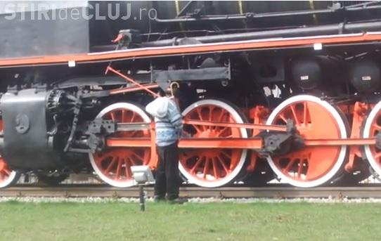 În loc să fie admirată de turiști, un boschetar o folosește pentru a urina pe ea, chiar sub nasul angajaților de la Căile Ferate Române.