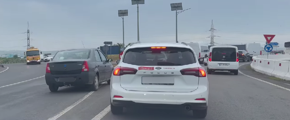 Șoferul care a încălcat regulile de circulație a avut noroc cu un alt participant la trafic care l-a lăsat să revină pe banda sa de mers, în timp ce din partea opusă se pot observa mașini care se apropie către Logan.