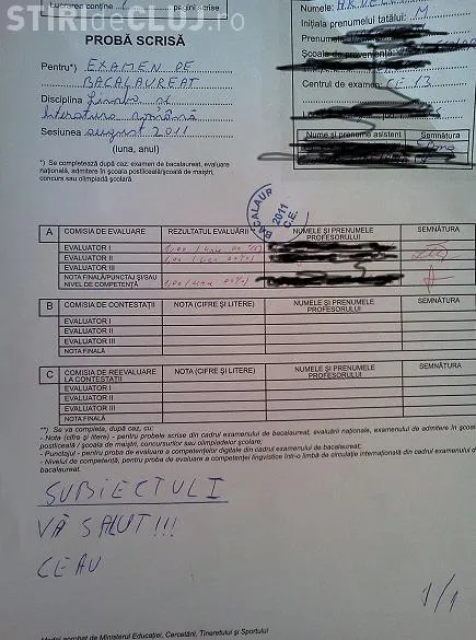 "Va salut!!! Ceau", a scris un absolvent de liceu din Bihor, fiind notat cu 1, potrivit informatiadebihor.ro.