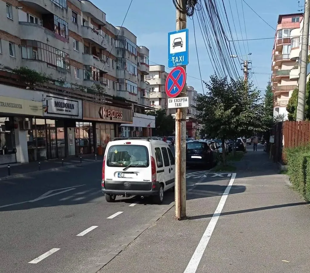 Lucrări a la Cluj: Stand de taxi pe trotuar, cu un stâlp pe mijloc