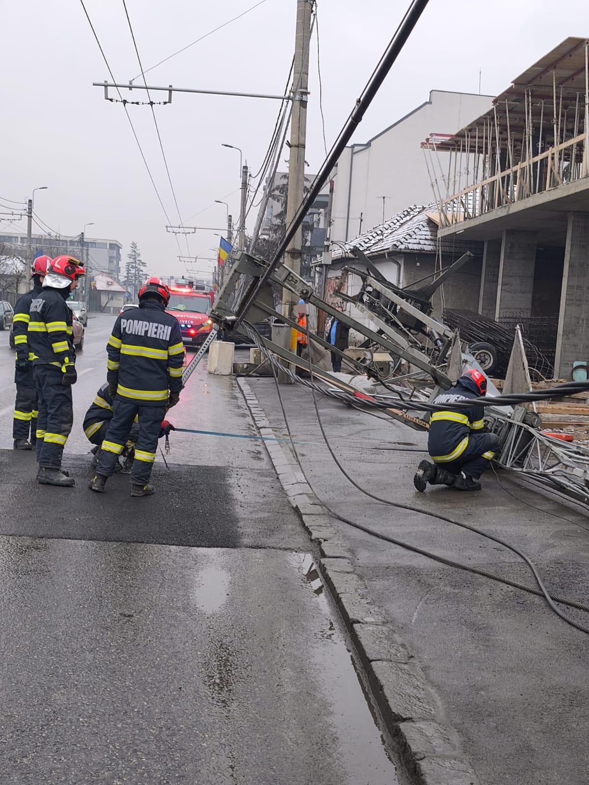 „Pompierii din cadrul Detașamentului 1 Cluj-Napoca intervin în aceste momente pe strada Traian Vuia din Cluj-Napoca, unde o macara a căzut peste firele de curent.