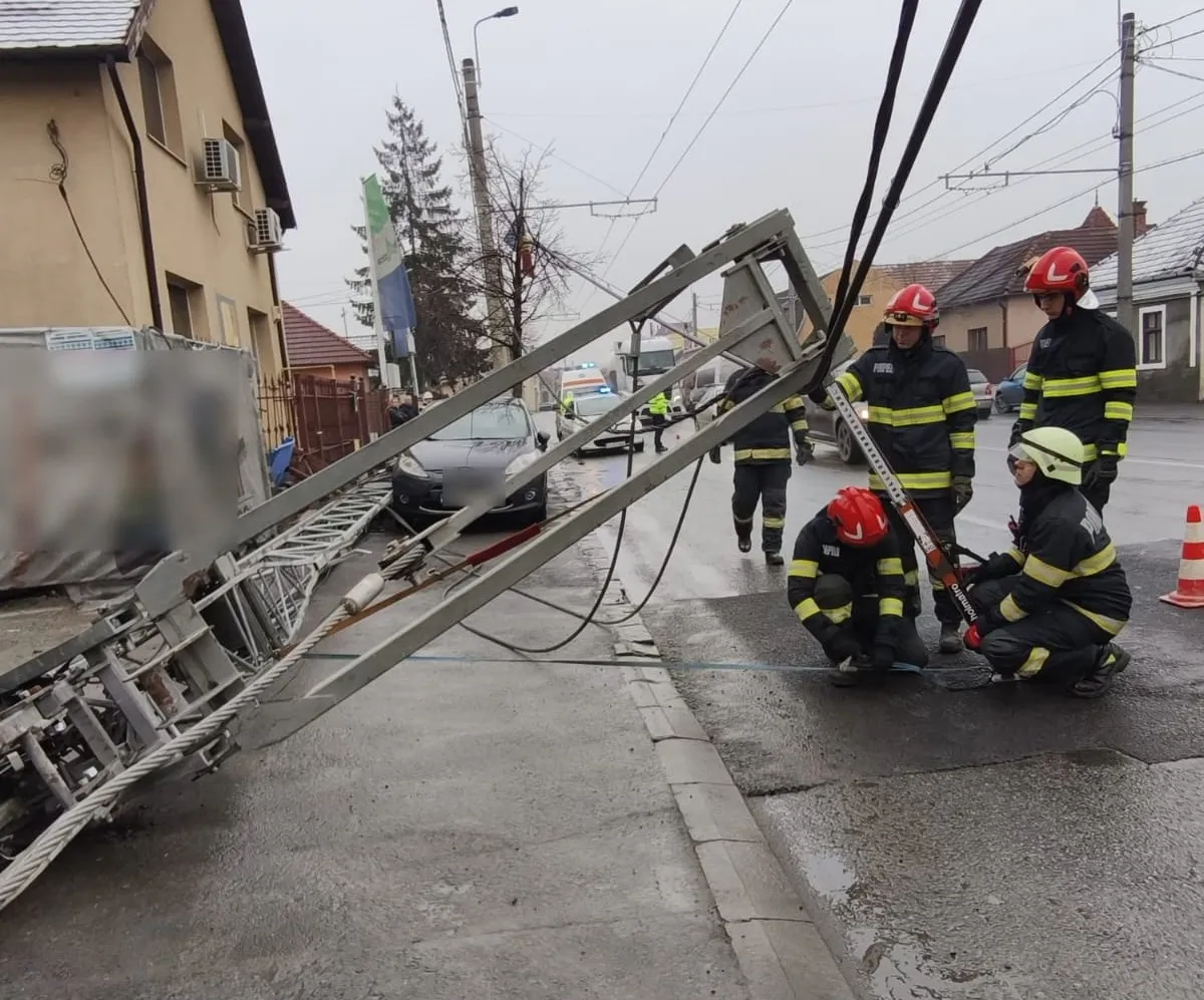 Pompierii clujeni au intervenit miercuri, 22 ianuarie, pe strada Traian Vuia din Cluj-Napoca, unde o macara a căzut peste firele de curent. Conform ISU Cluj, o mașină a fost ușor avariată.
