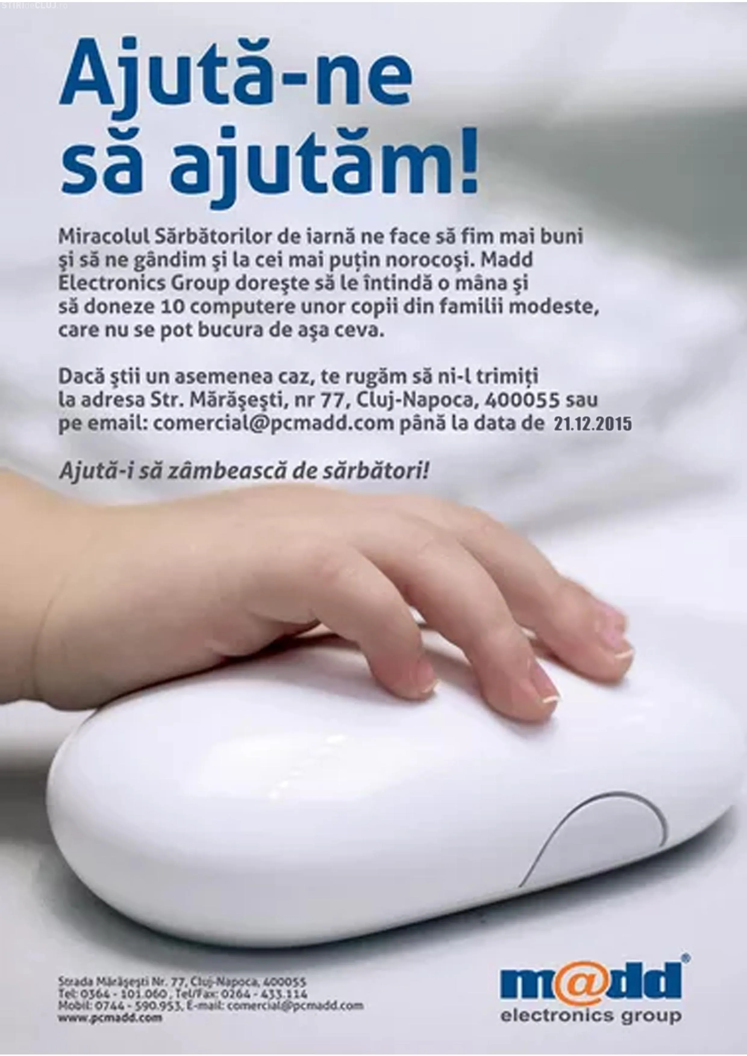 Dacă știi un astfel de caz, poți să trimiți datele la adresa strada Mărășești, nr. 77, Cluj-Napoca, sau pe email: comercial@pcmadd.com, până în data de 21.12.2015.