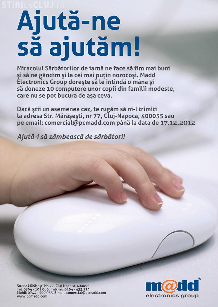 Dacă știi un copil provenit dintr-o familie modestă, care are rezultate bune la școală și are nevoie de un calculator pentru a străluci, trimite cazul la adresa Str. Mărășești Nr. 77 Cluj-Napoca sau pe email-ul comercial@pcmadd.com până la data de 17.12.2012.