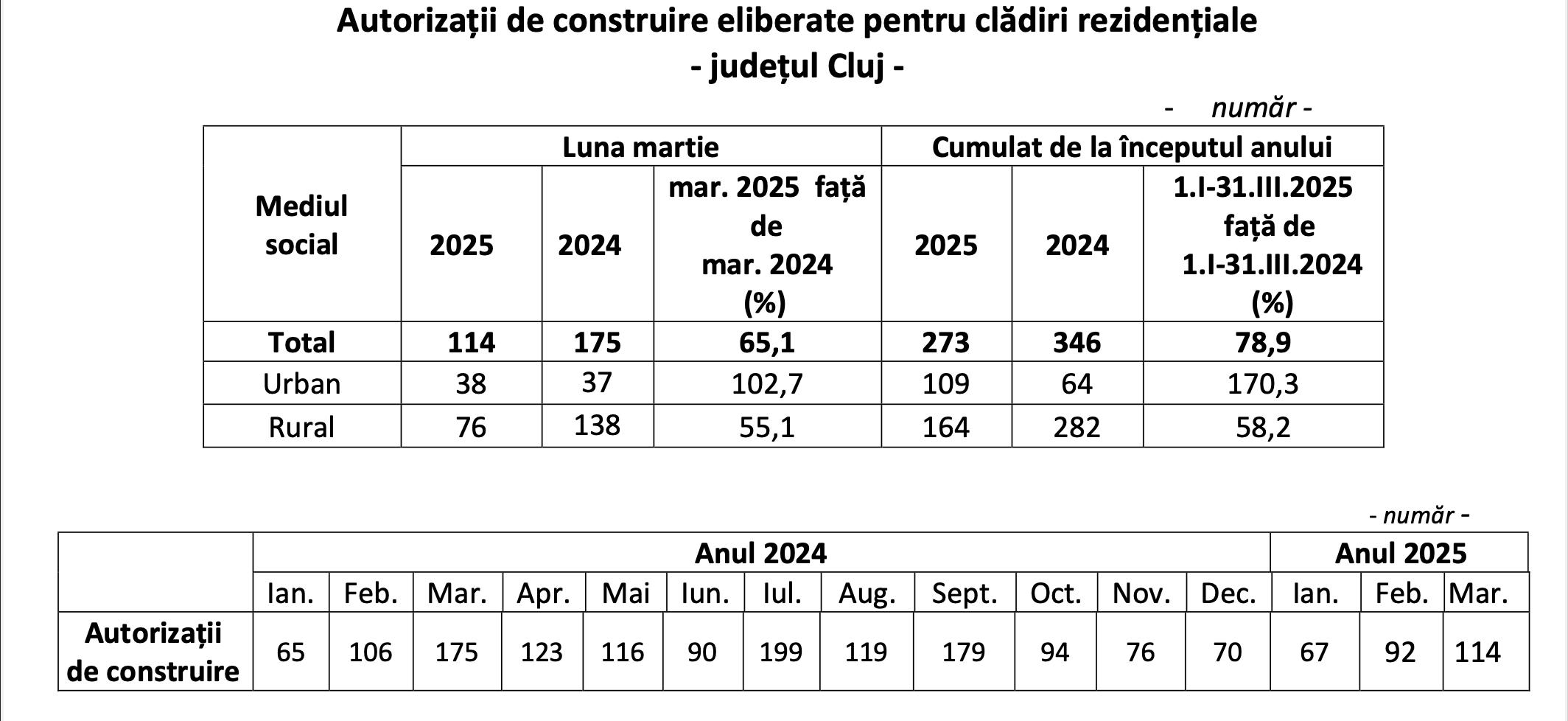 În perioada 1 ianuarie – 31 martie 2025, au fost eliberate 273 de autorizații de construire pentru clădiri rezidențiale, cu 73 mai puține decât în aceeași perioadă a anului trecut, ceea ce înseamnă o scădere de 21,1%.