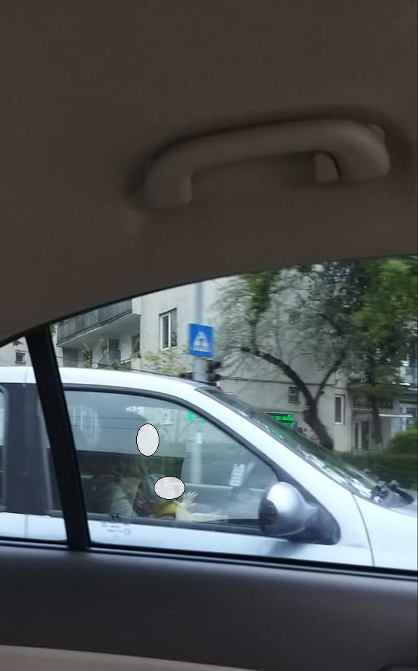 O mamă a fost fotografiată în timp ce conducea autoturismul prin Gheorgheni, având copilul de câțiva ani în brațe.