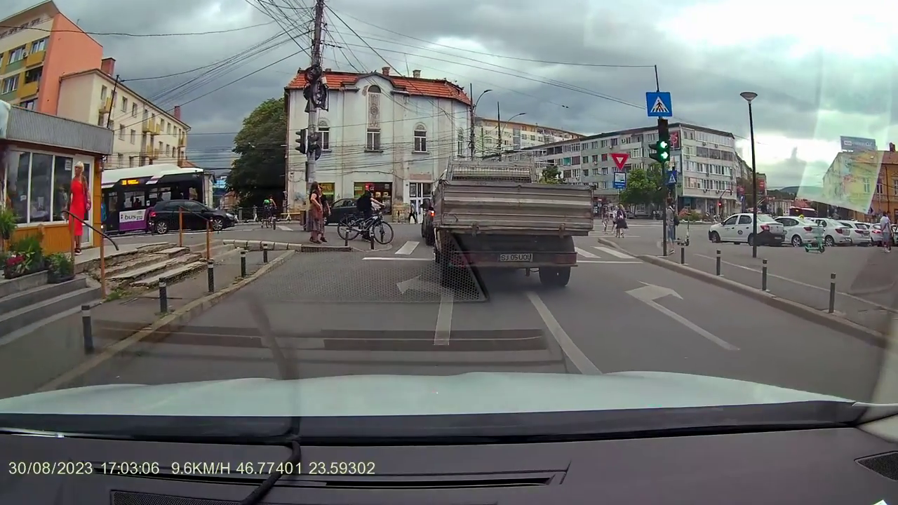 Femeia nu a vrut să traverseze regulamentar, ci a trecut drept prin fața mașinilor care veneau dinspre strada Constanța și făceau stânga spre strada Cuza Vodă. Femeii nu i-a păsat nici că are un copil în scaunul de pe portbagajul bicicletei, a ridicat o mână și a trecut prin fața șoferilor consternați.