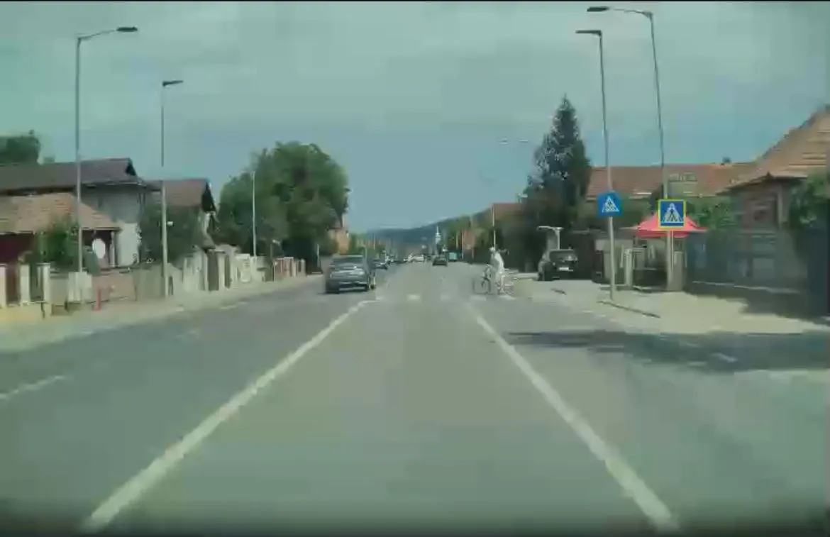 Un pieton care se afla deja angajat în traversarea străzii, pe trecerea de pietoni, având o bicicletă lângă el, a fost ignorat complet de un șofer grăbit, care a decis să îl ocolească prin banda a doua, cu o manevră de-a dreptul inconștientă