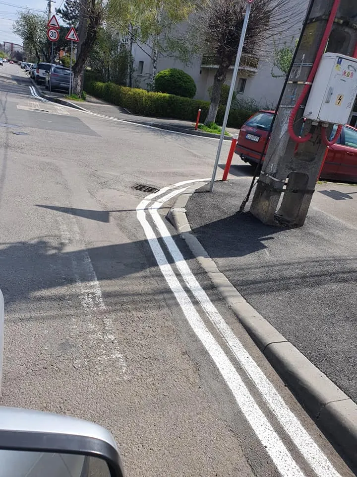 Cele două benzi semnifică faptul că oprirea este interzisă. În alte zone din Gherogheni, la intersecții au fost montați stâlpișori, pentru a nu mai fi blocată vizibilitatea.