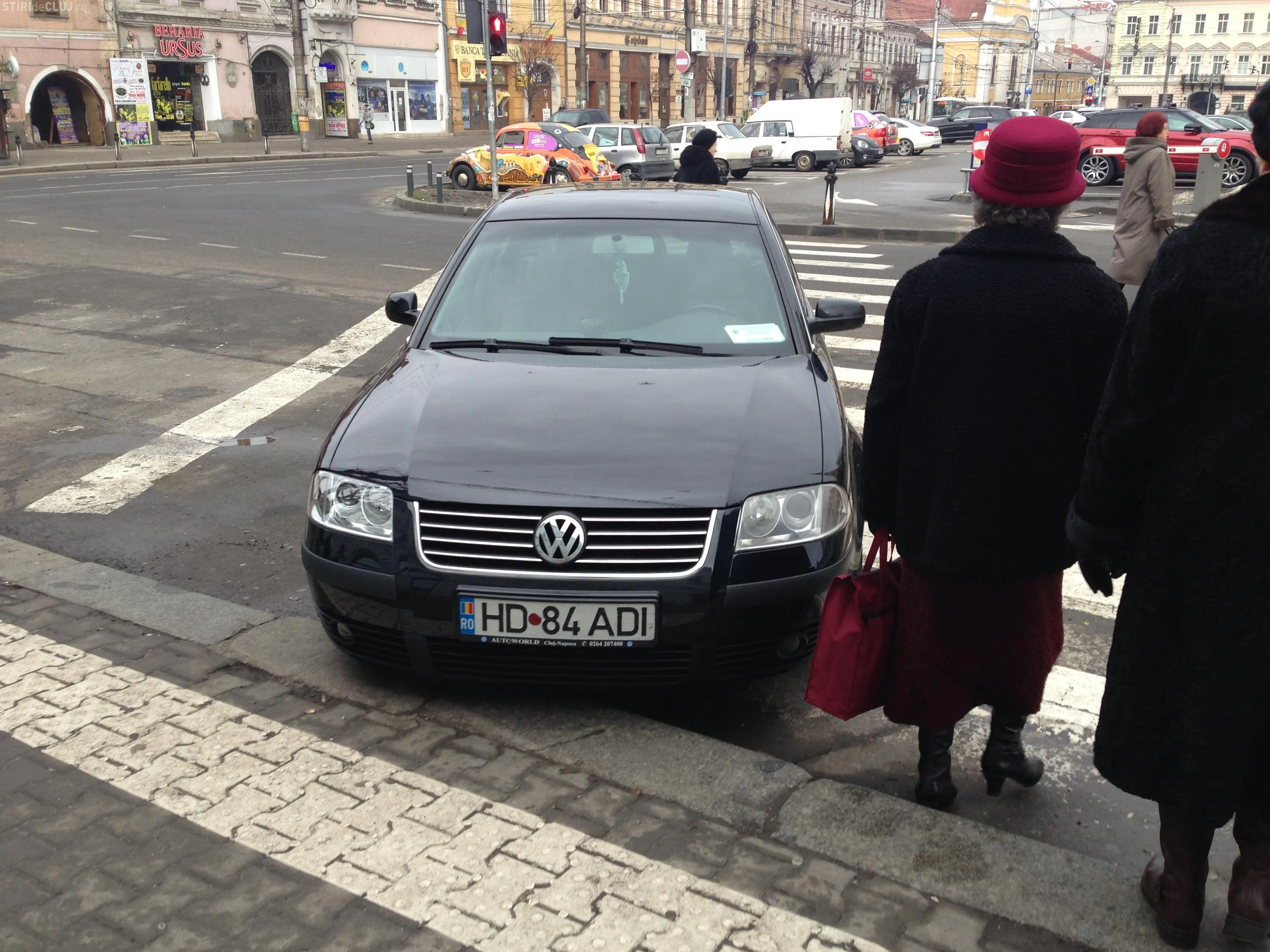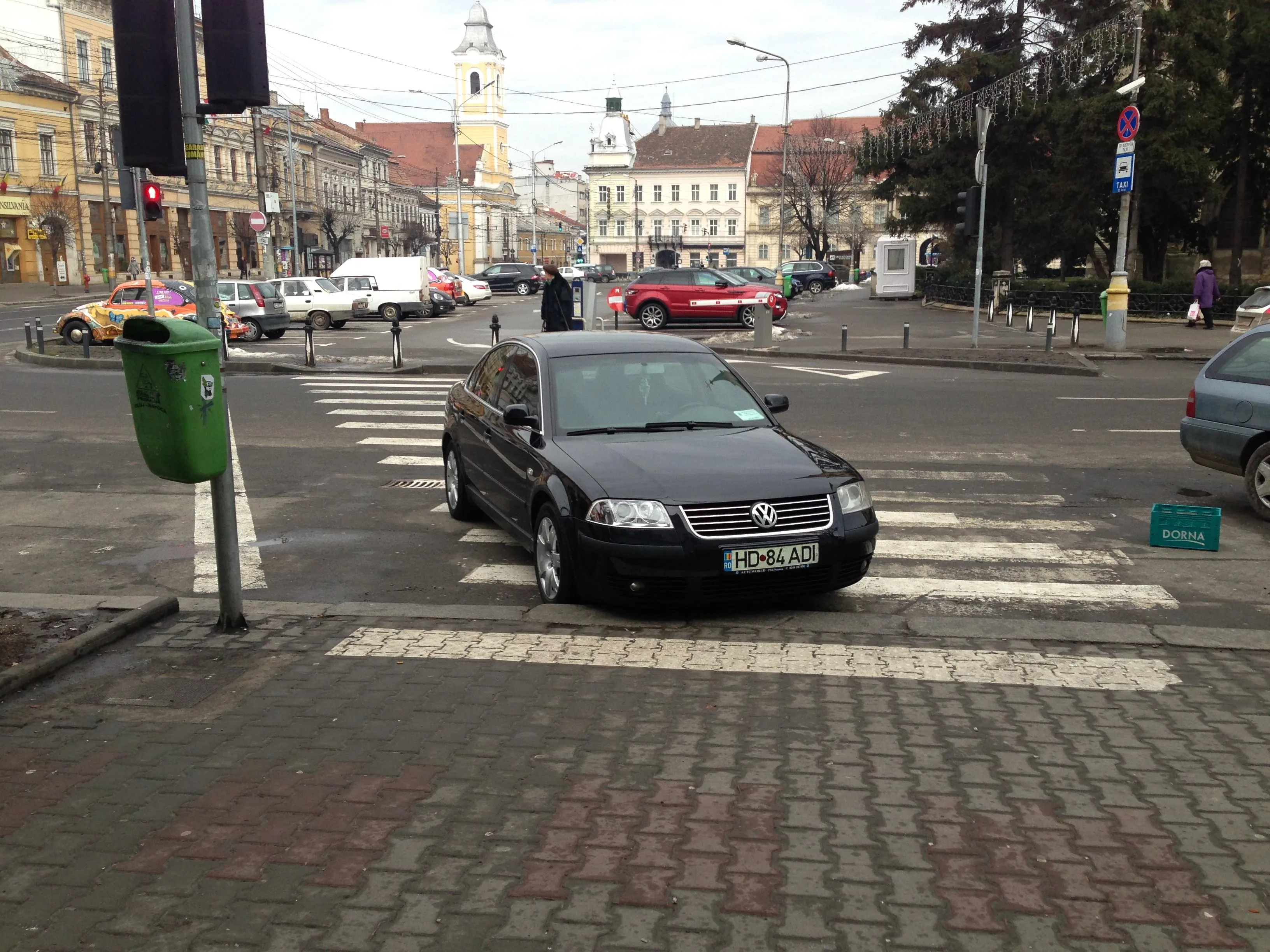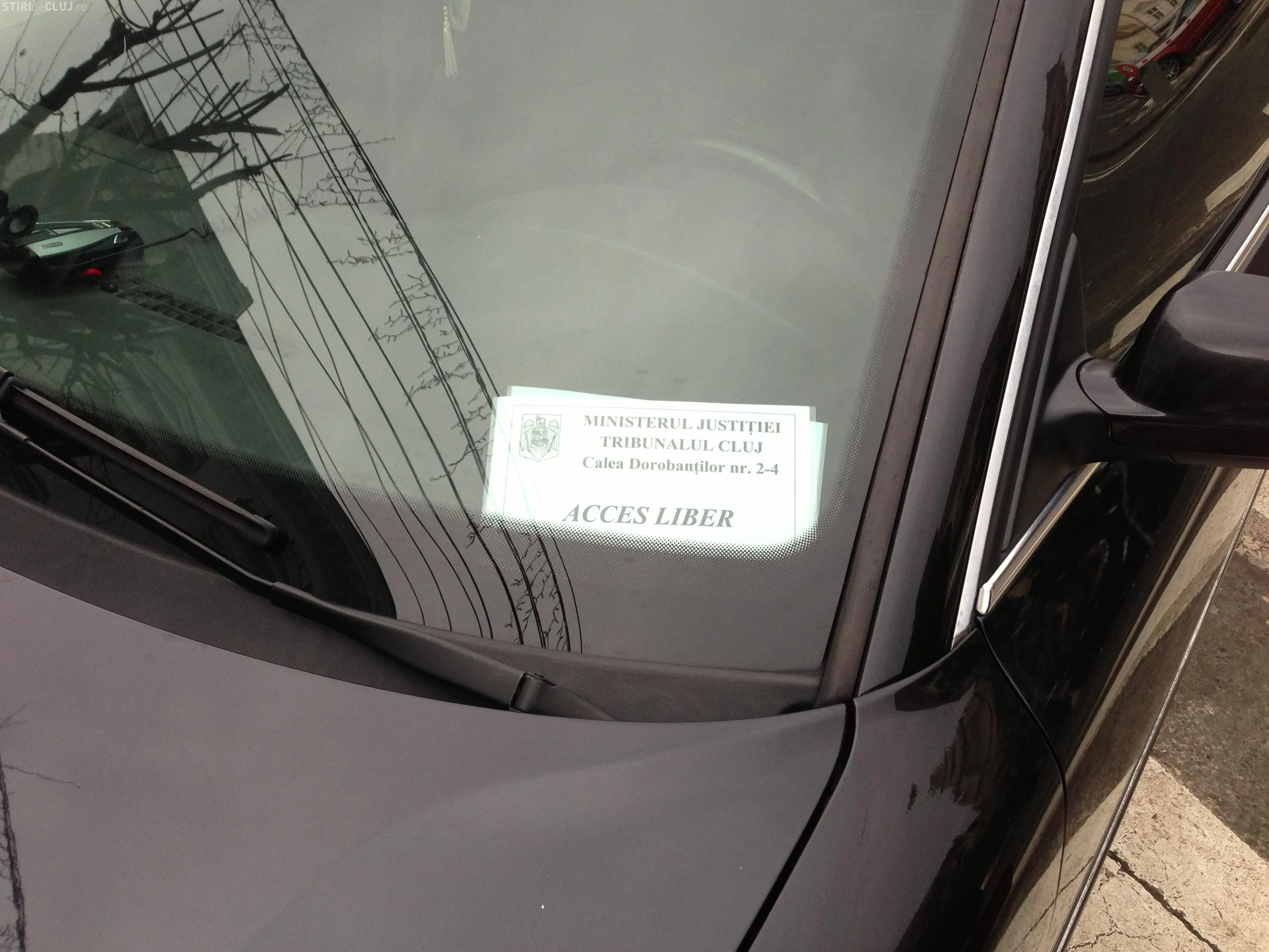 Un VW Passat, cu permis de liberă trecere ce poartă însemnele Tribunalului Cluj, a fost fotografiat parcat pe trecerea de pietoni din fața Diesel.