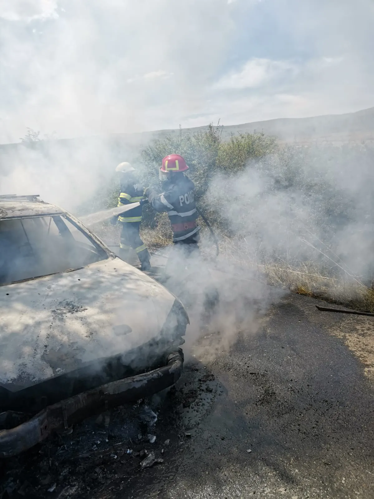În momentul sosirii pompierilor autoturismul era cuprins în totalitate de flăcări, iar ocupanții erau ieșiți din acesta.