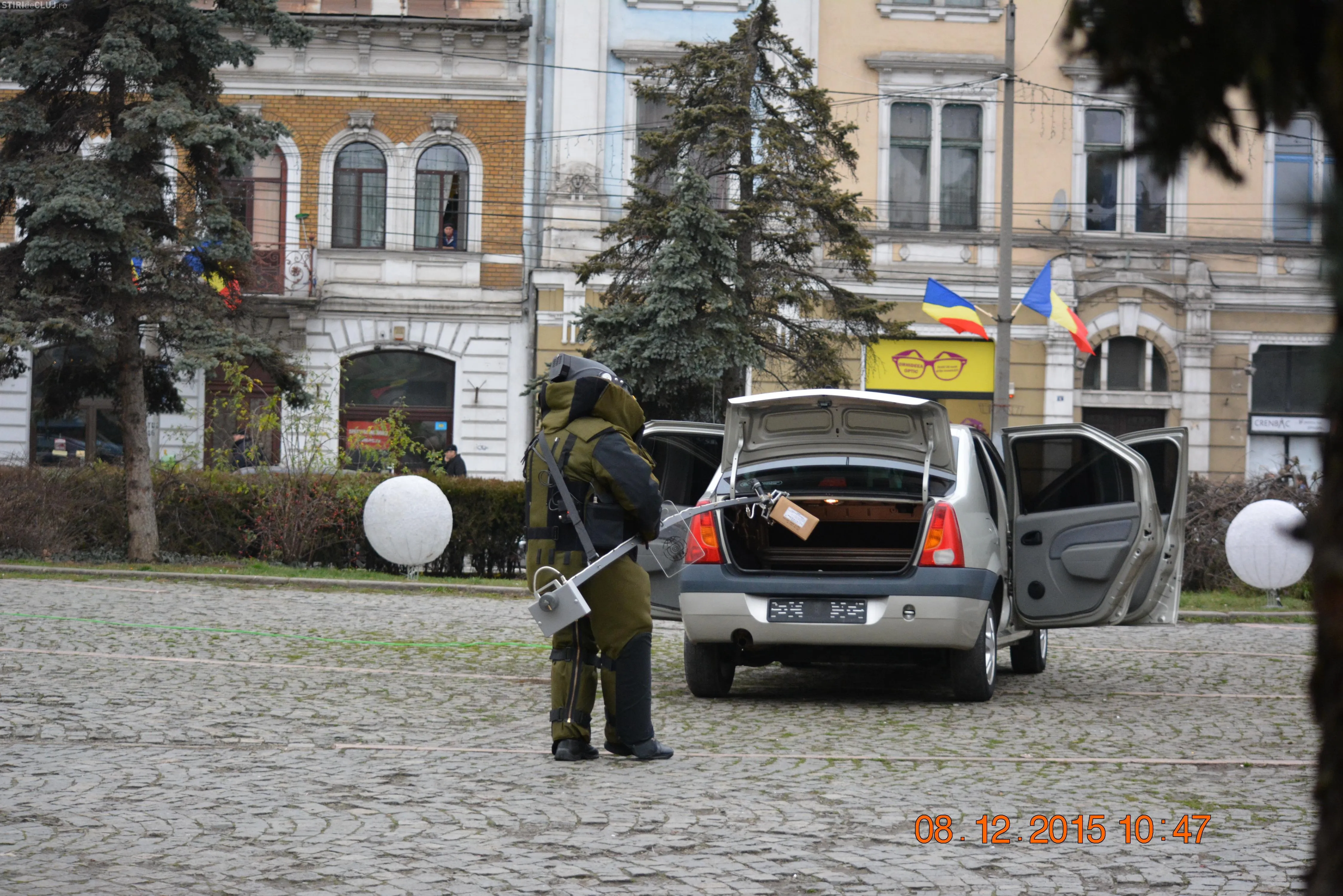 Forțele de securitate au intervenit marți dimineața, în Piața Mihai Viteazu, unde s-a anunțat existența unei mașini capcană. Totul a fost parte din exercițiul ”POROLISSUM 15”.