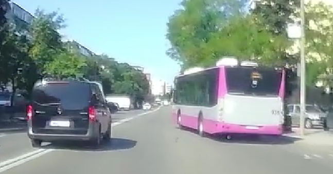 Întâmplarea a fost surprinsă de către un participant la trafic în cartierul Mărăști. O dubiță de culoare neagră cu numere MAI a fost văzută în timp ce depășește, trecând de dubla linie continuă, un autobuz care iese din alveolă.