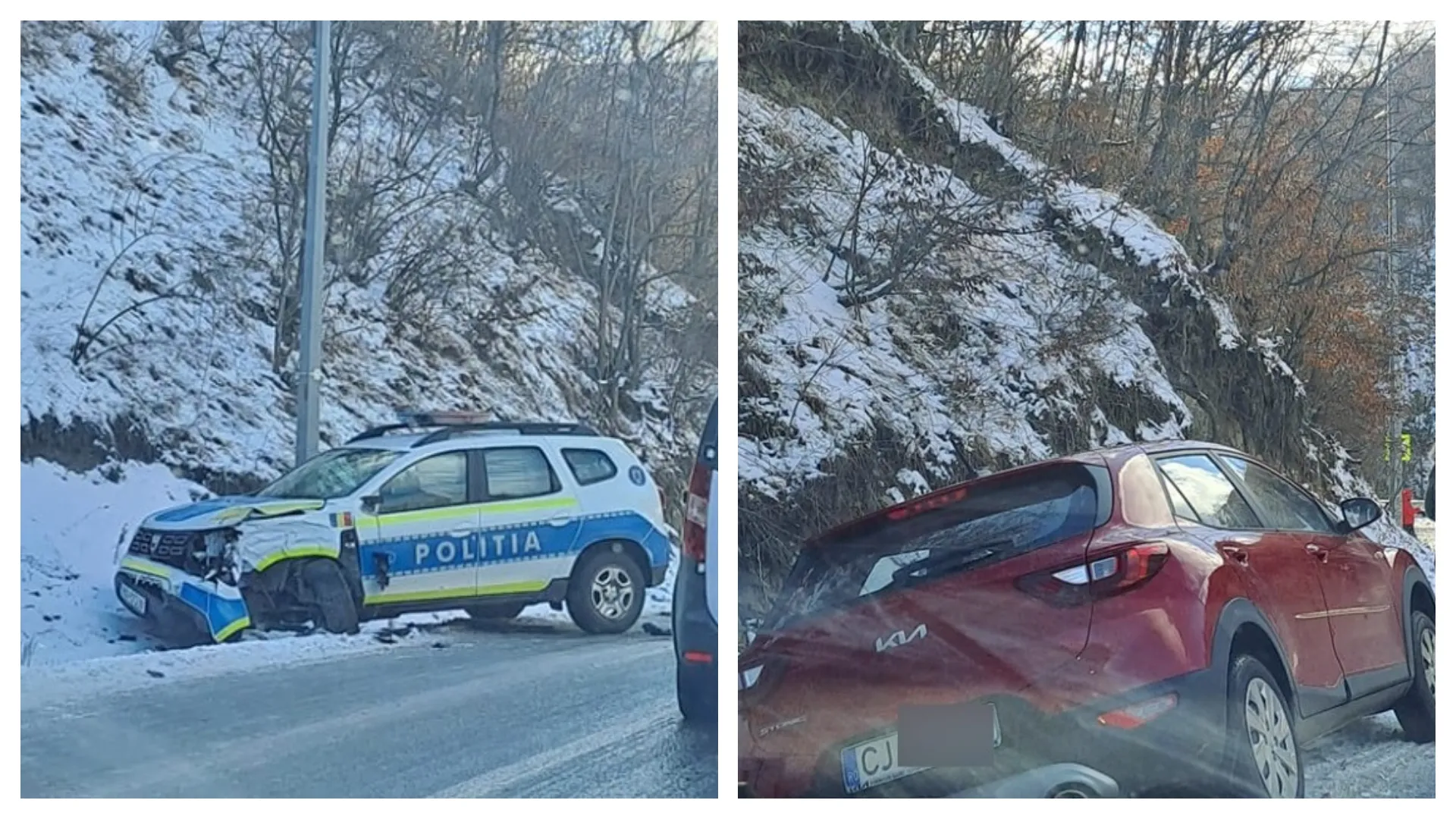Mașină de poliție implicată într-un accident pe un drum cu polei din Cluj! Totul s-a întâmplat într-o curbă, în care un șofer a pierdut controlul volanului
