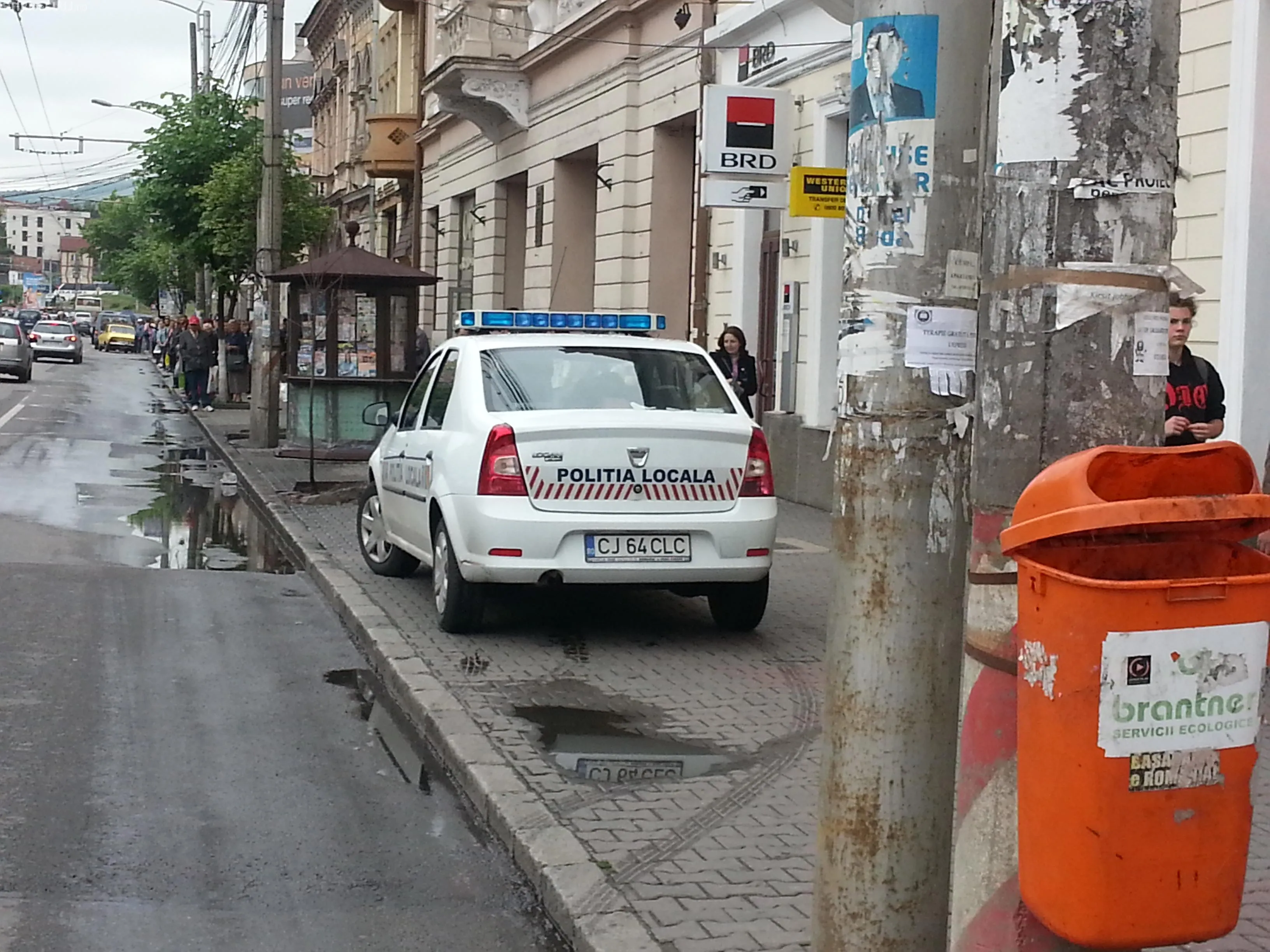 Un autoturism al Politiei Locale a fost fotografiat cocotat pe trotuar, vis-a-vis de Teatrul National de catre un cititor Stiri de Cluj.