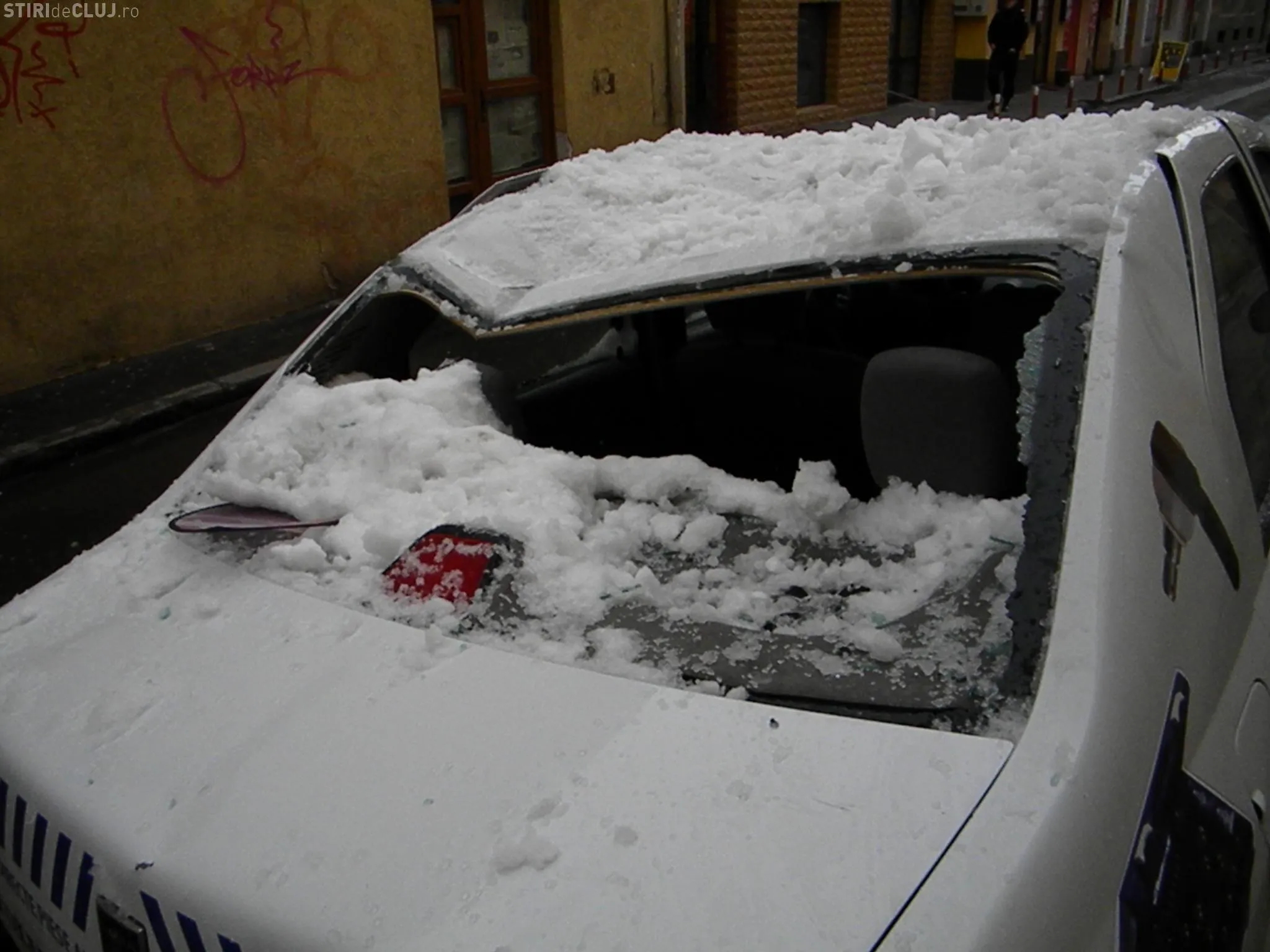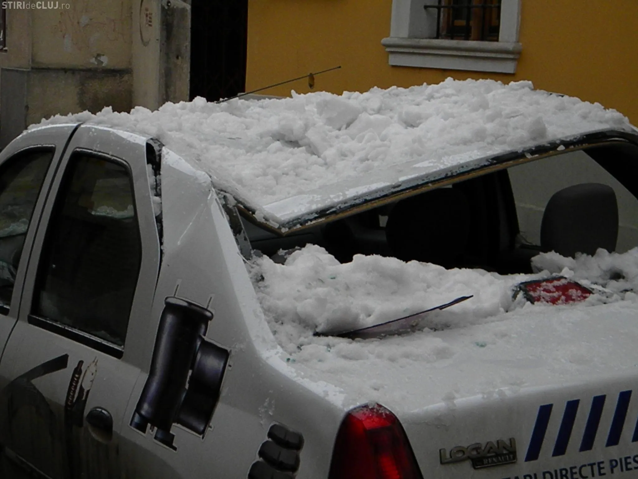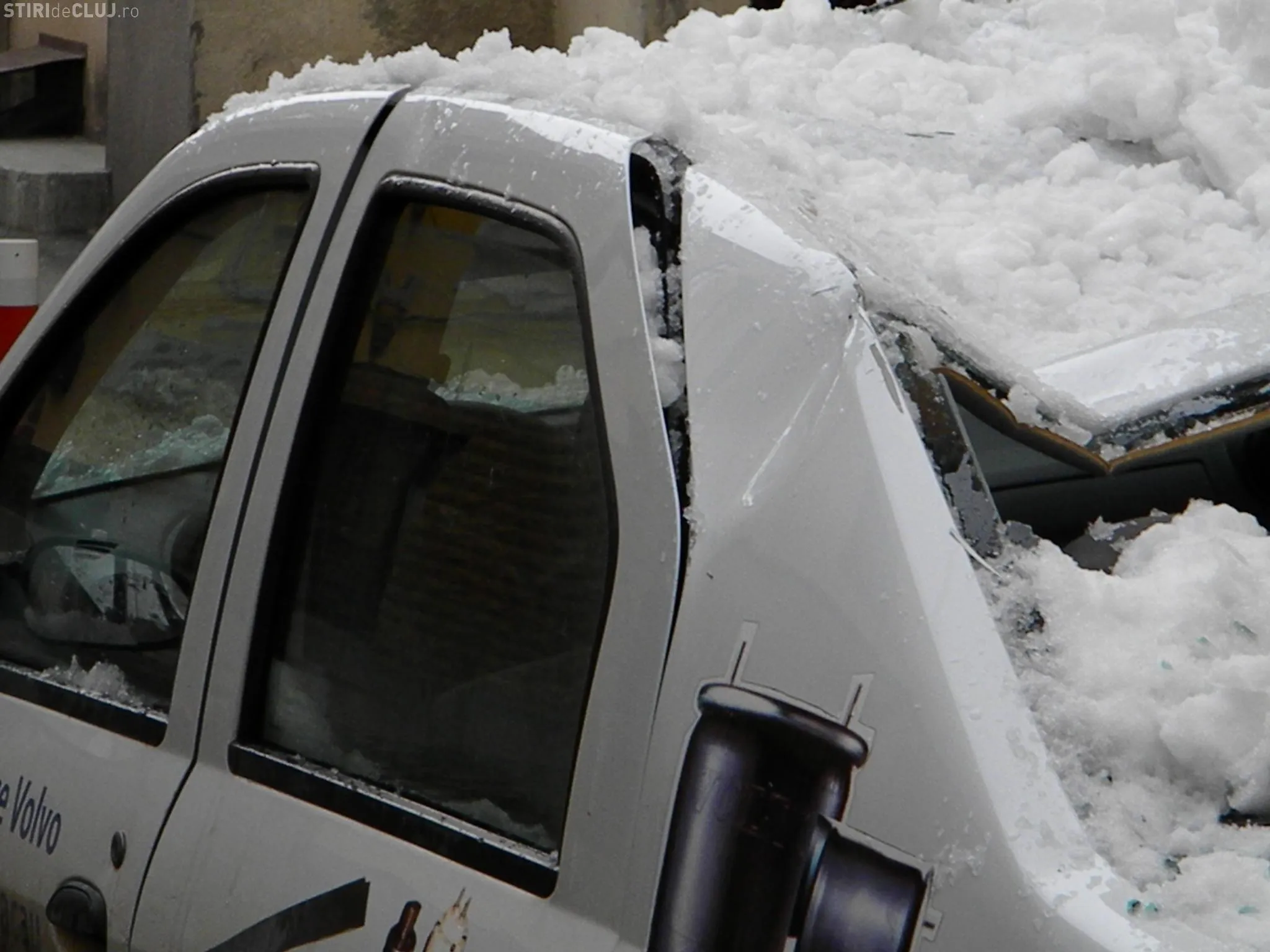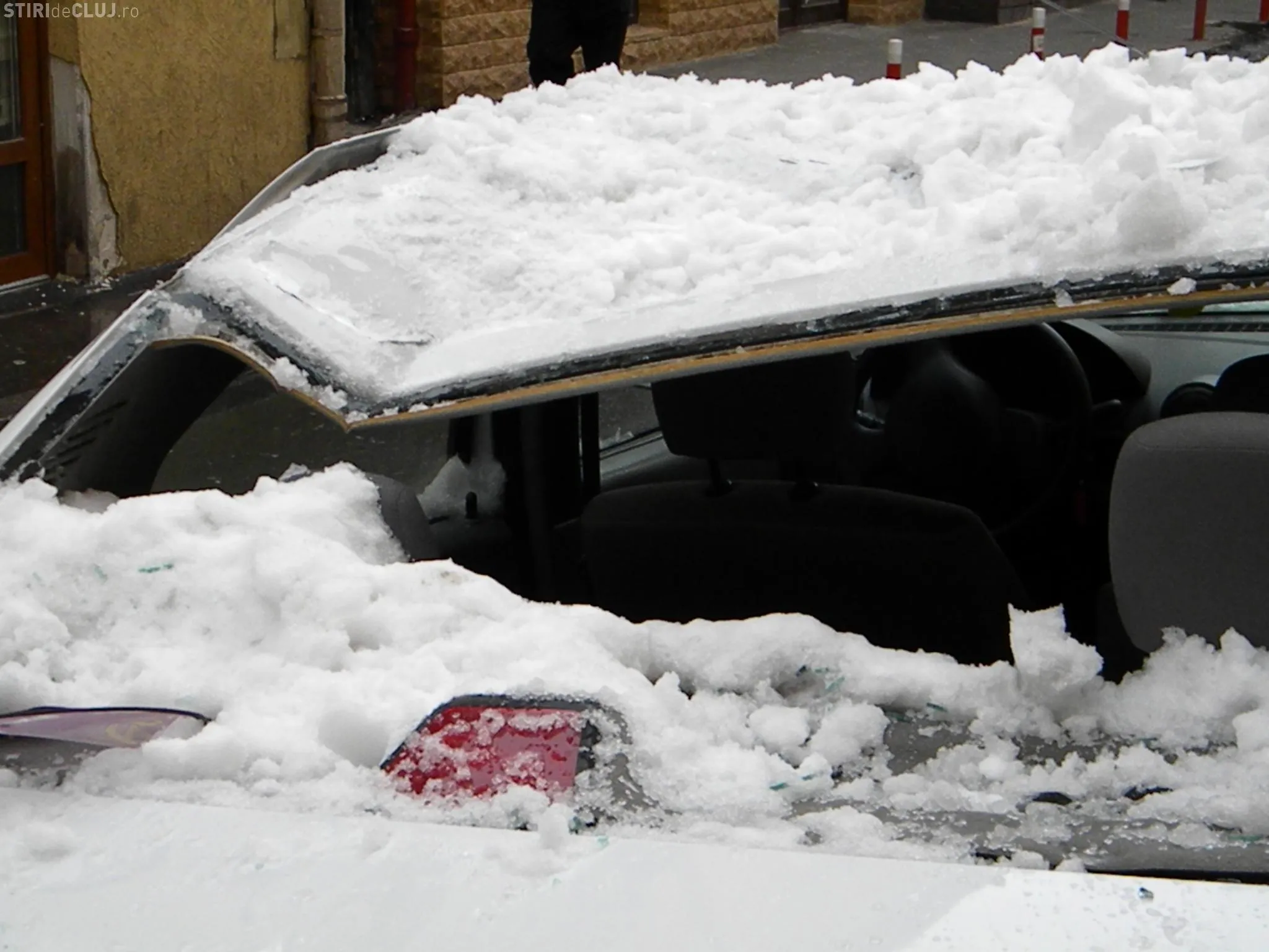Un autoturism a fost distrus de zapada in centrul Clujului, in jurul orei 16.20, de o bucata mare de zapada, care a cazut de pe acoperisul unei biserici.