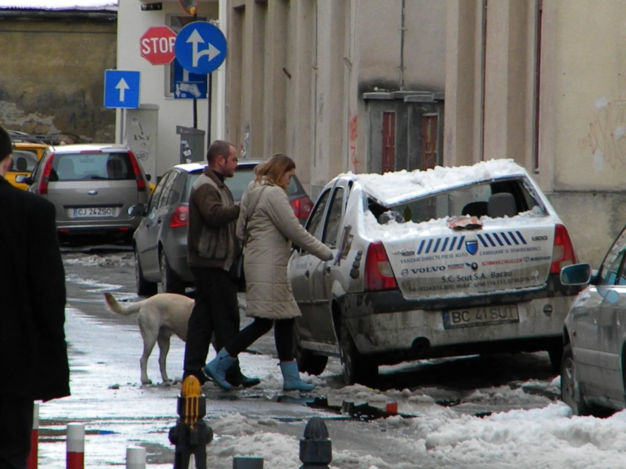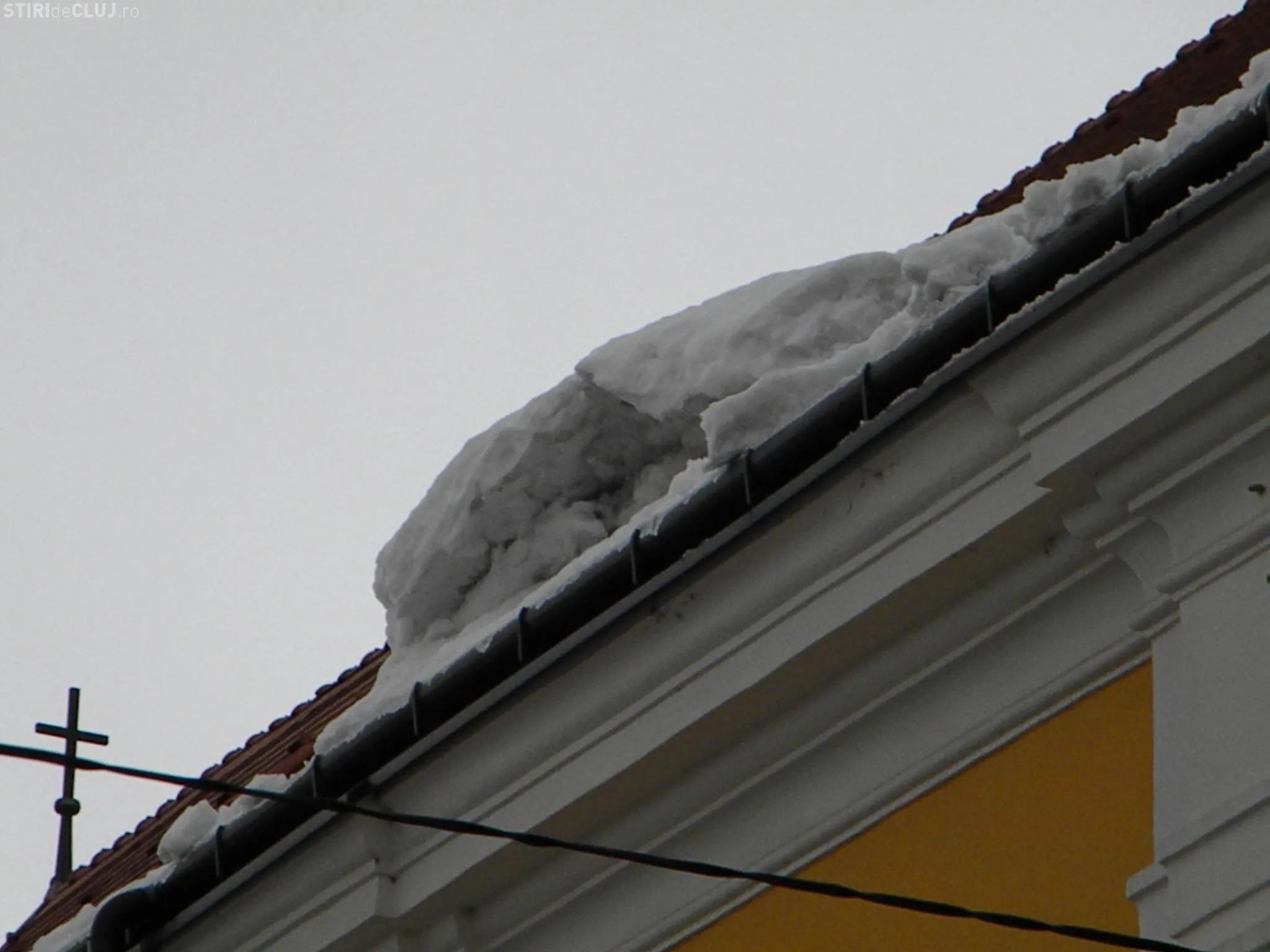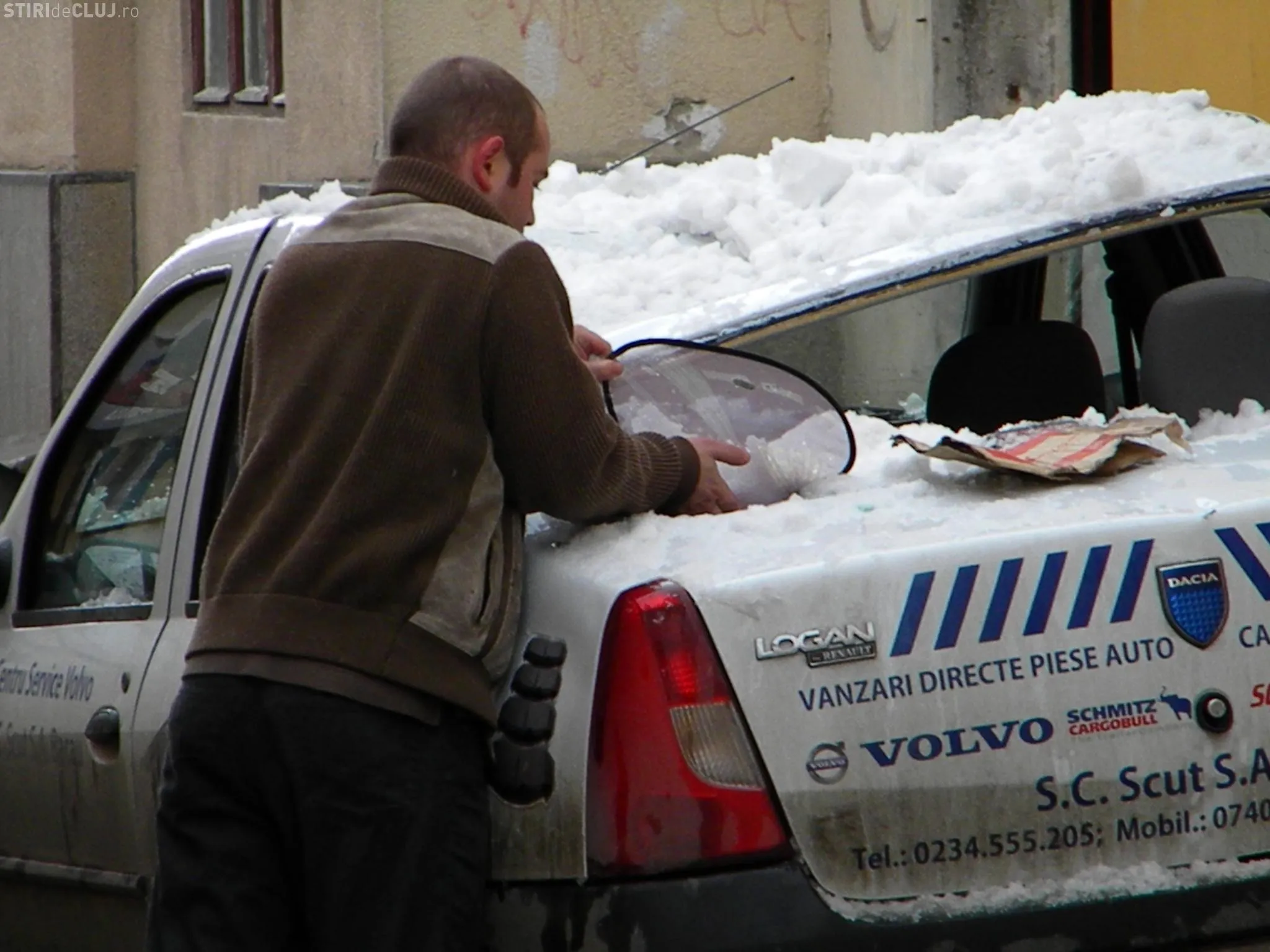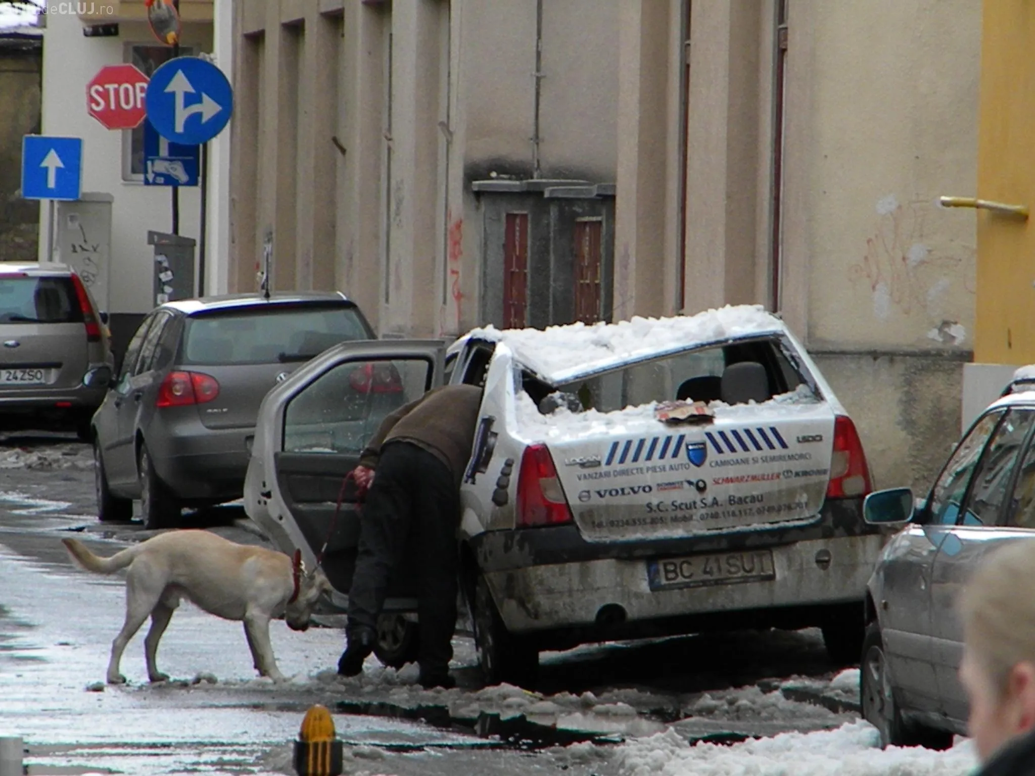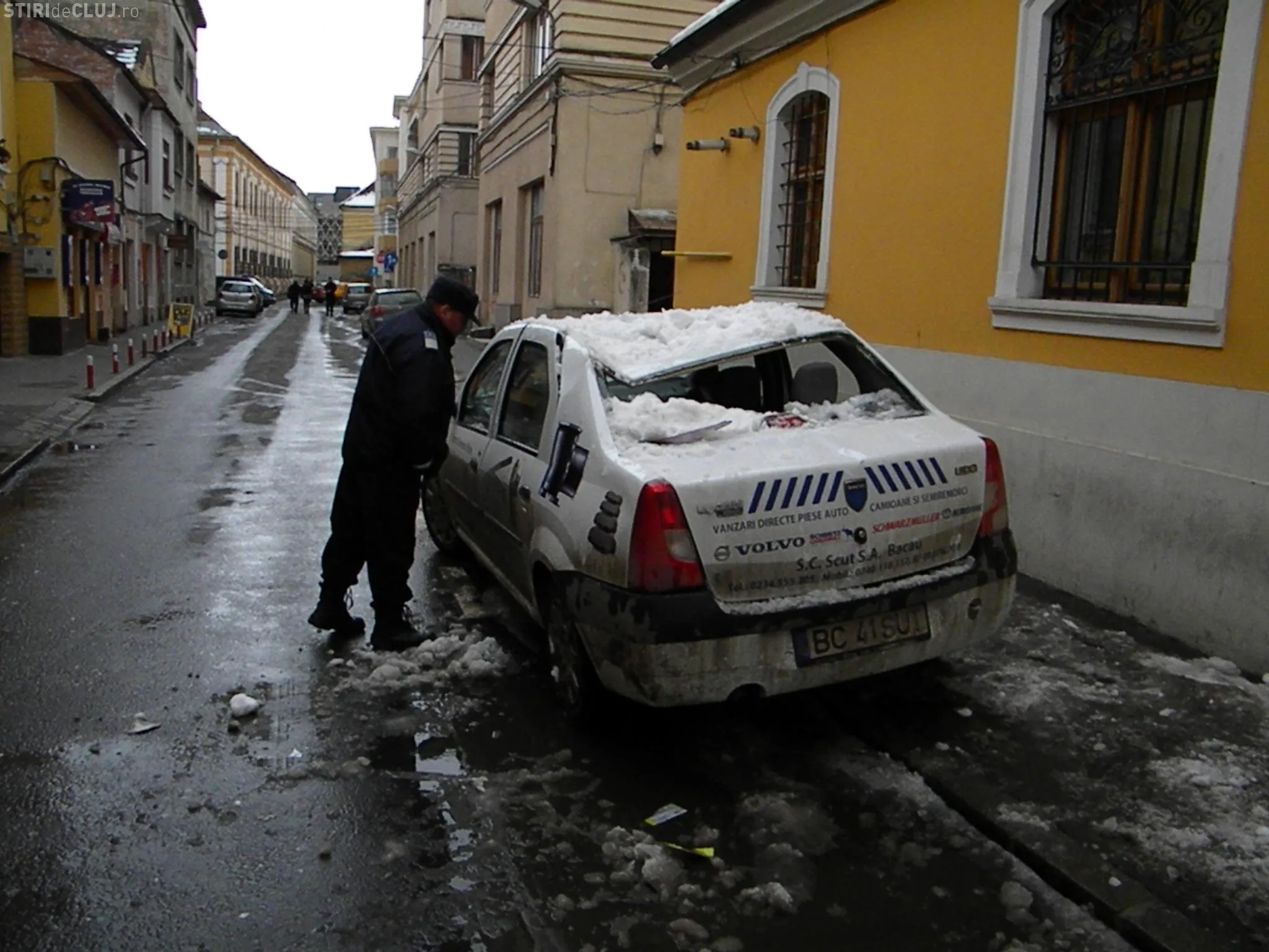 Un autoturism a fost distrus de zapada in centrul Clujului, in jurul orei 16.20, de o bucata mare de zapada, care a cazut de pe acoperisul unei biserici.
