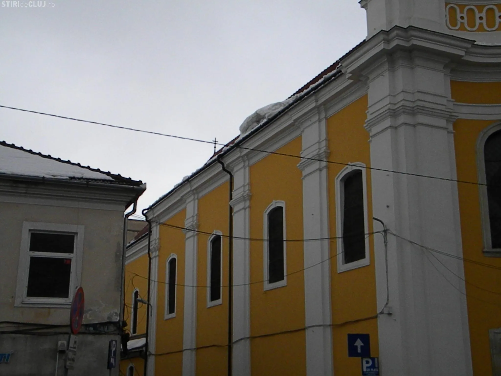 Strada Herman Oberth a fost inchisa de politie si urmeaza sa fie chemati pompierii pentru a indeparta zapada de pe acoperisul bisericii.