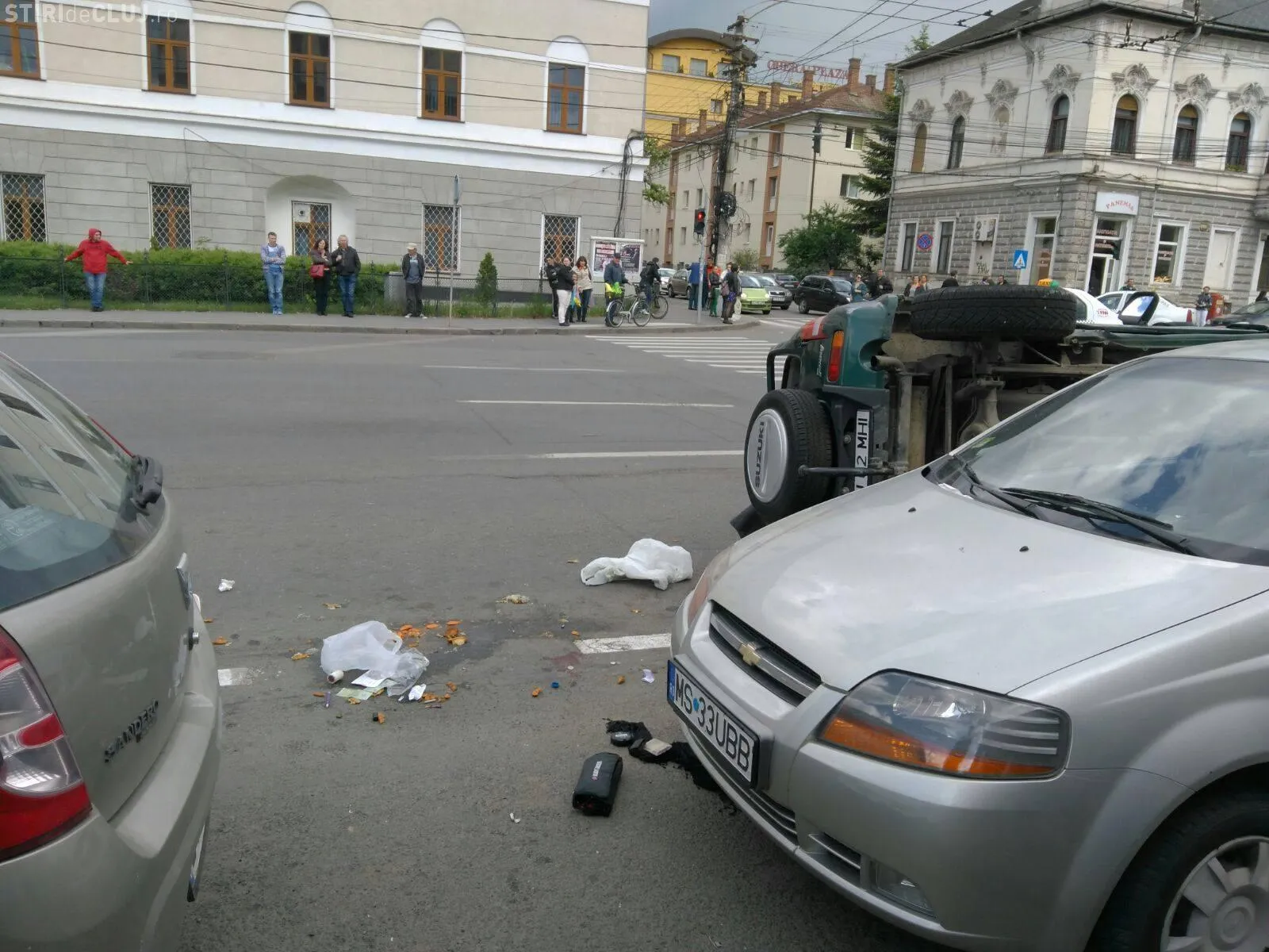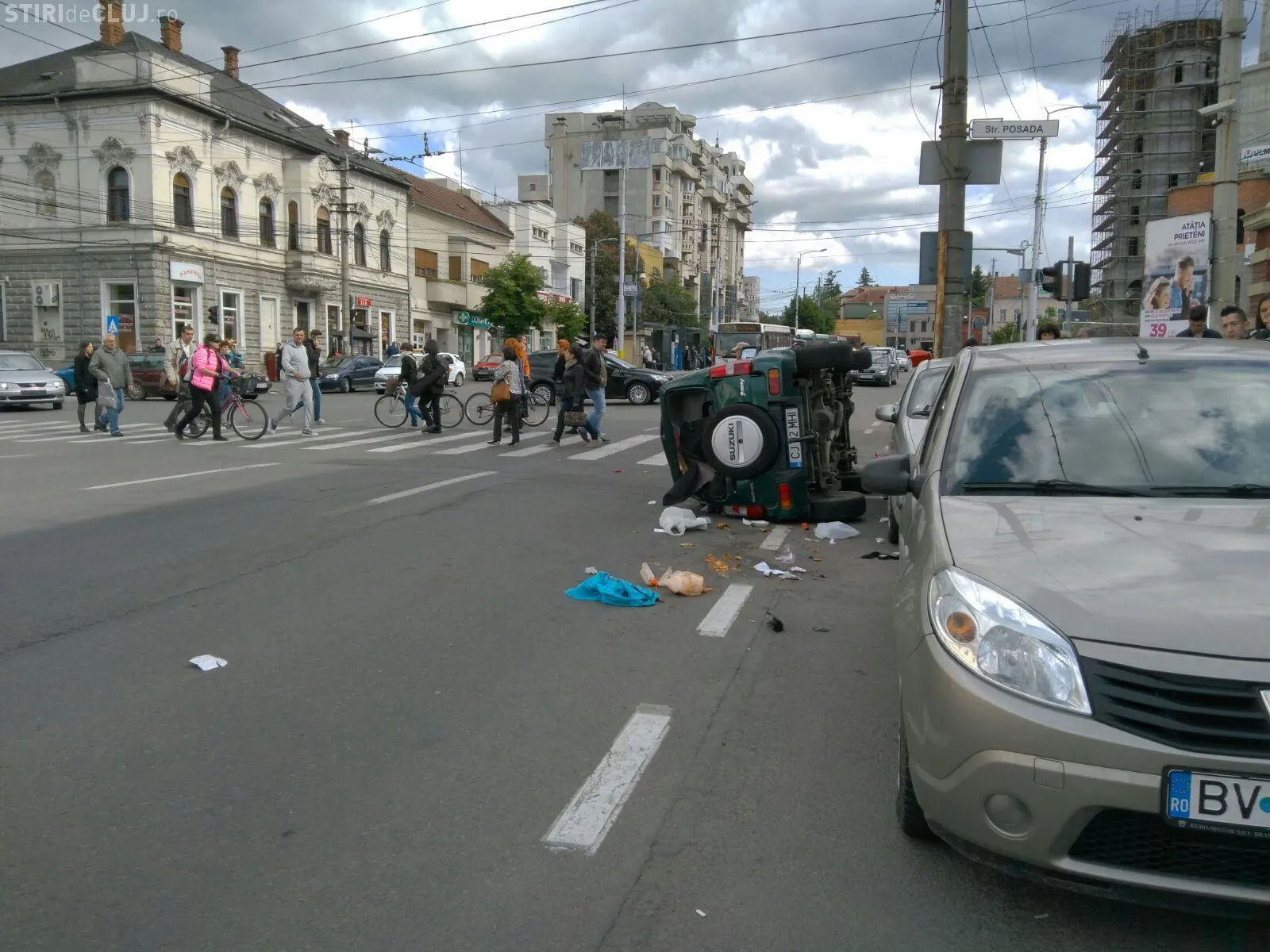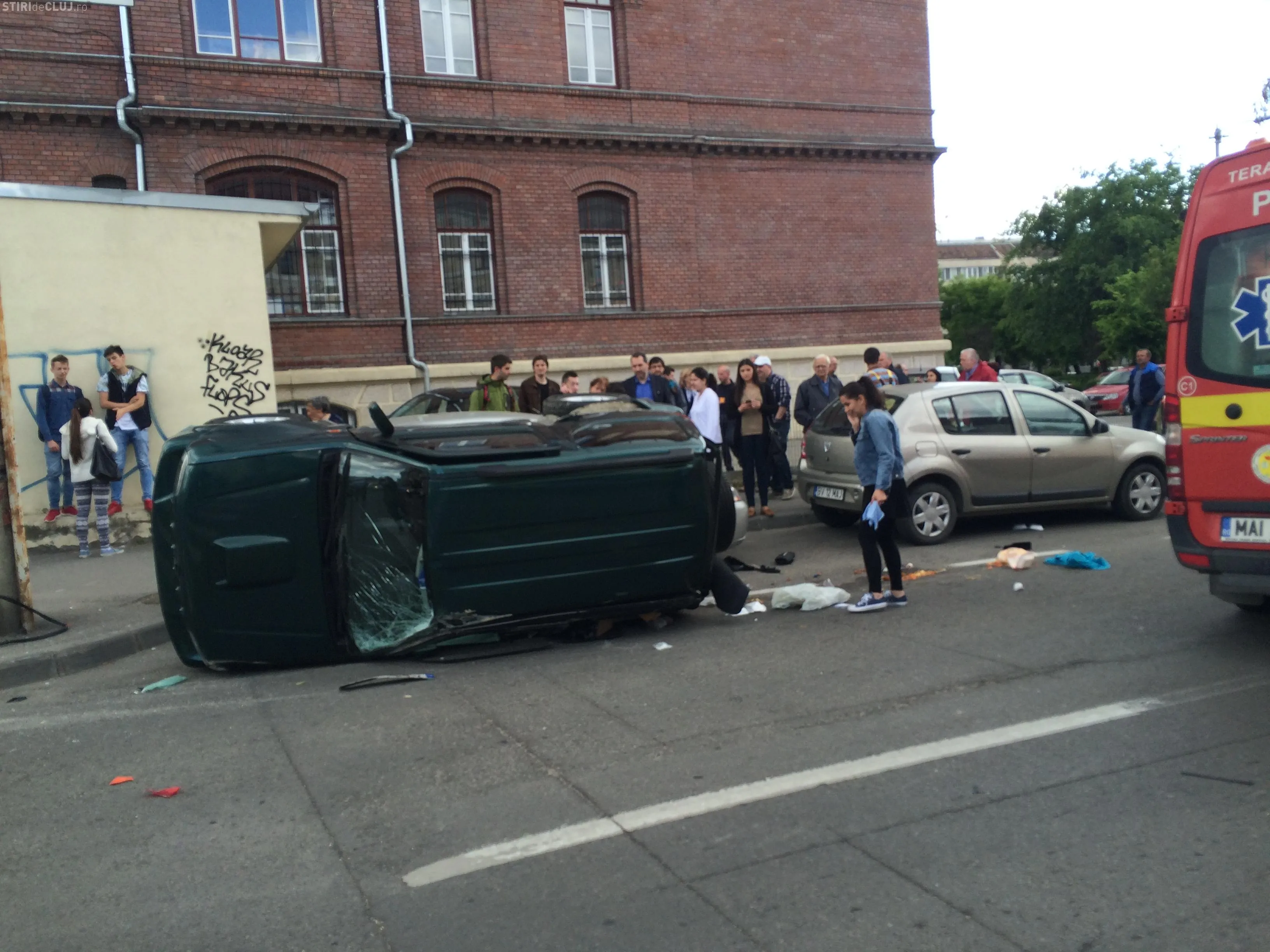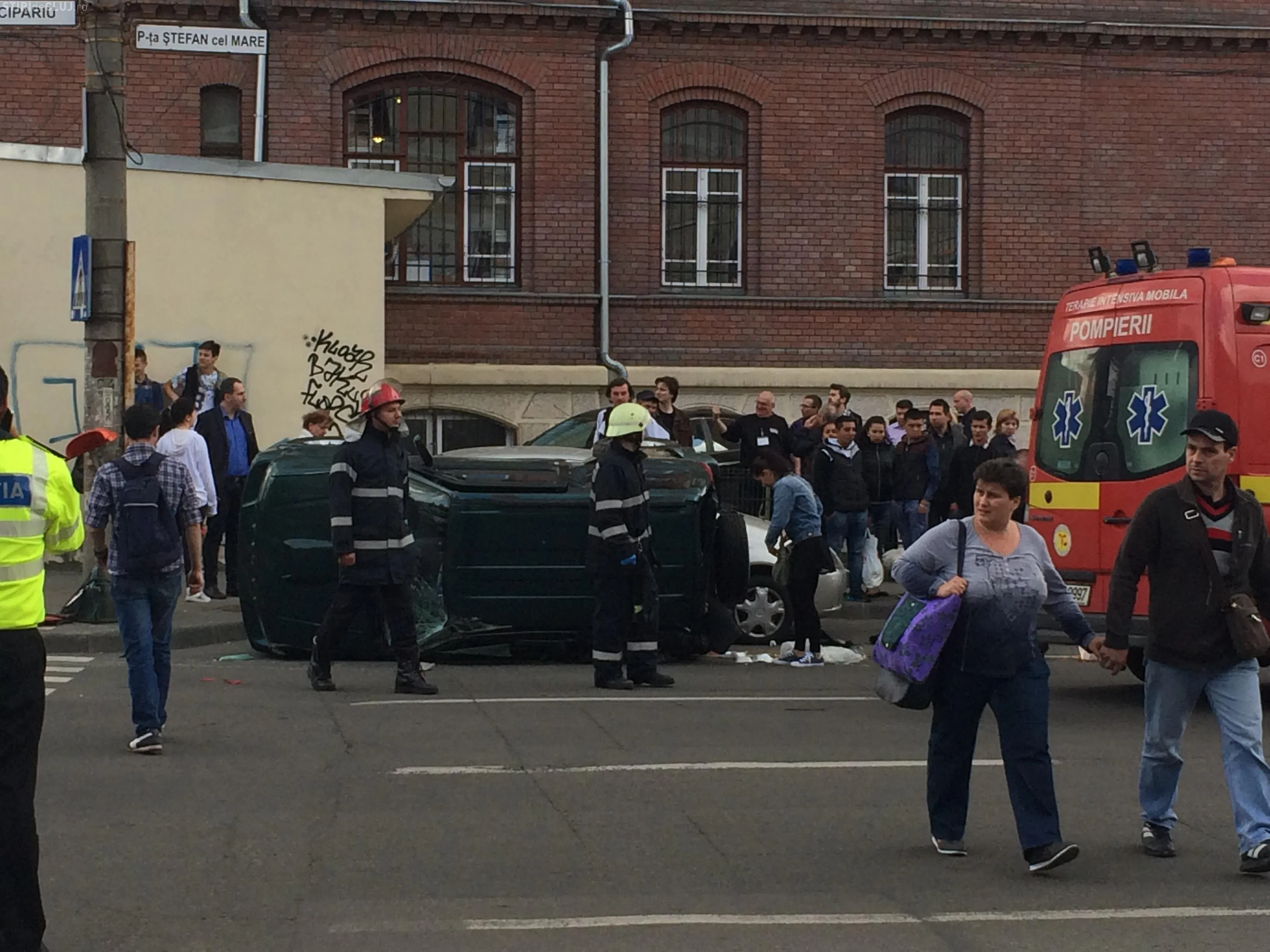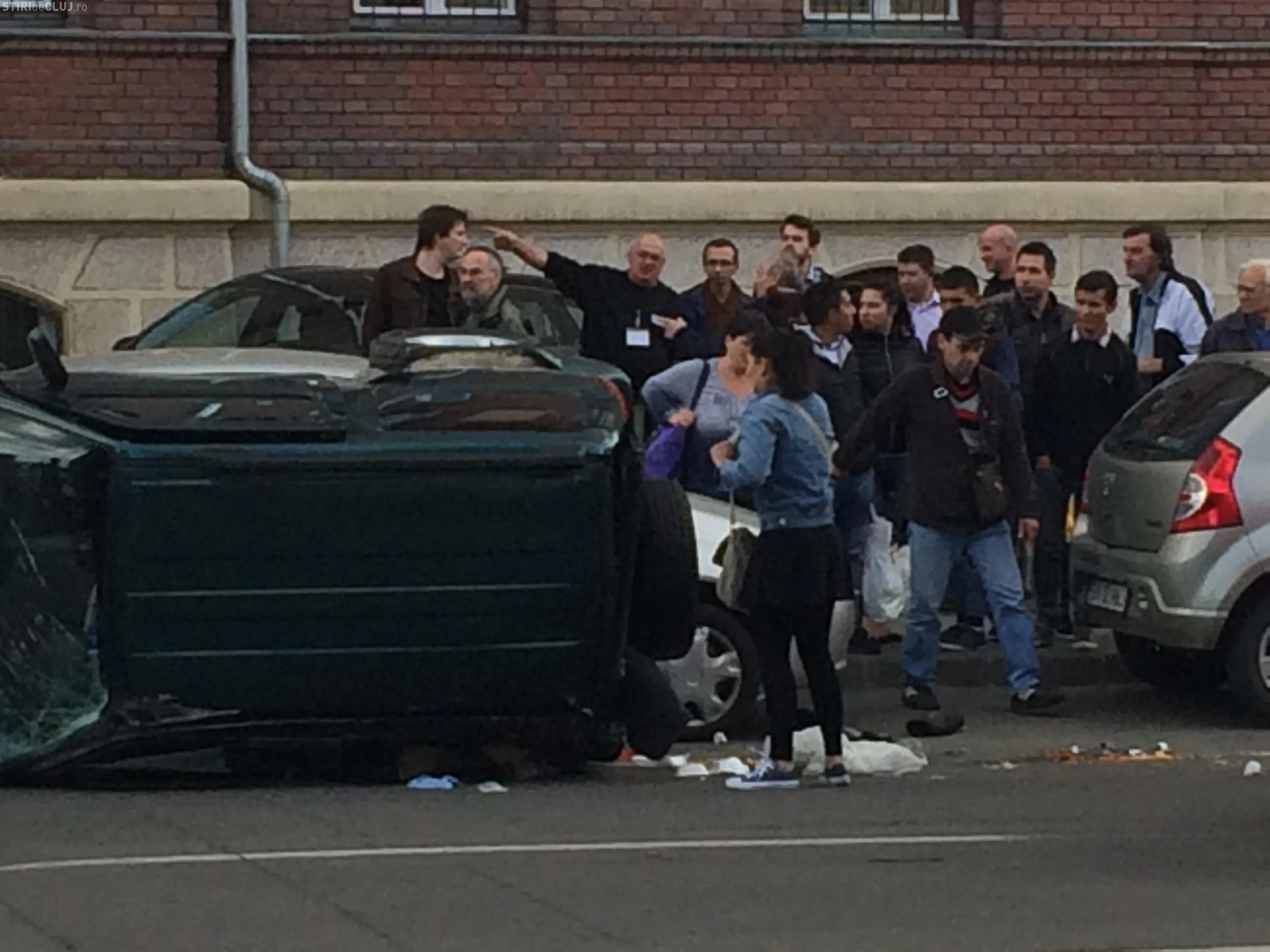 Mașină răsturnată în Piața Cipariu. A lovit și doi pietoni - FOTO