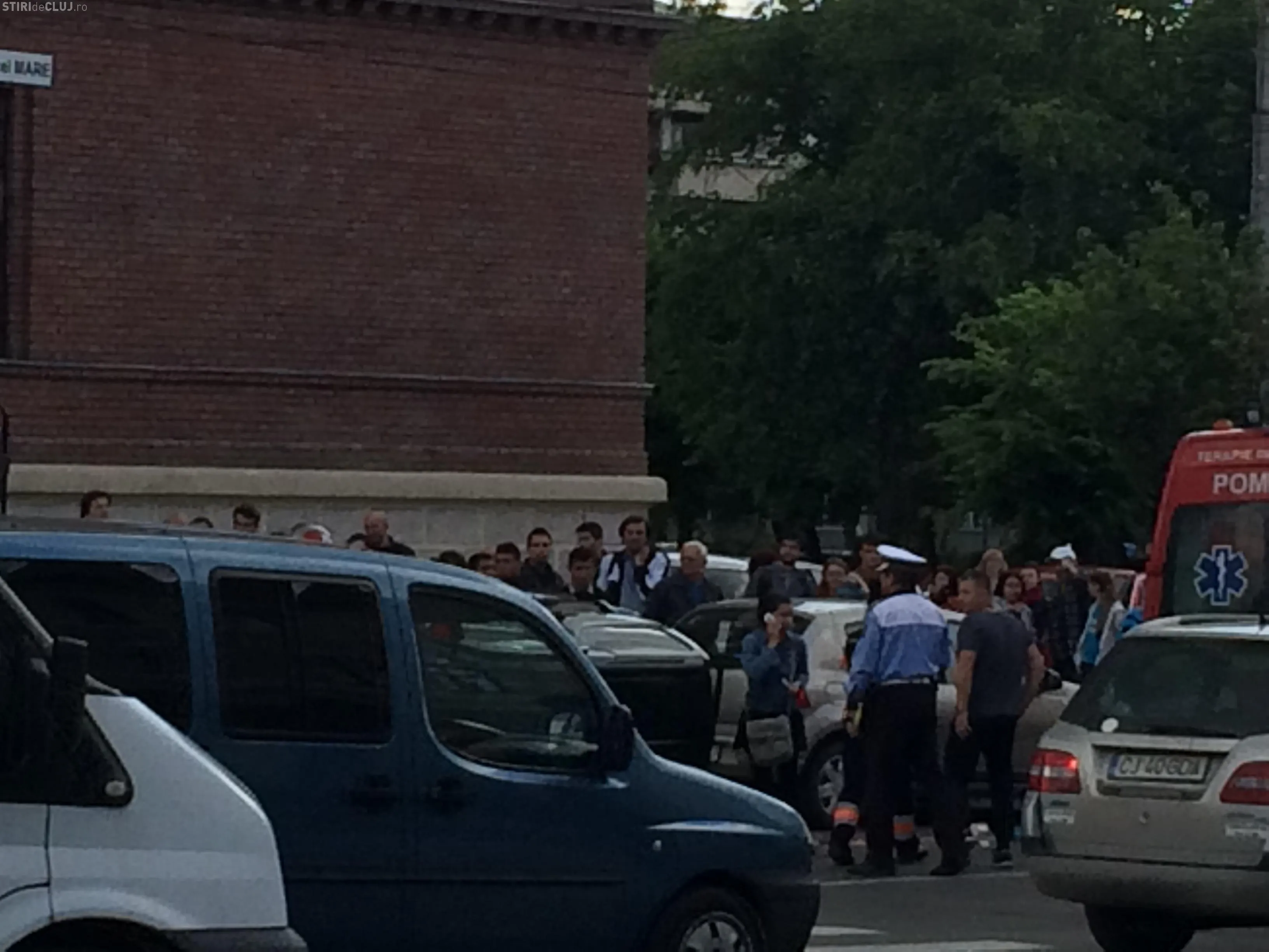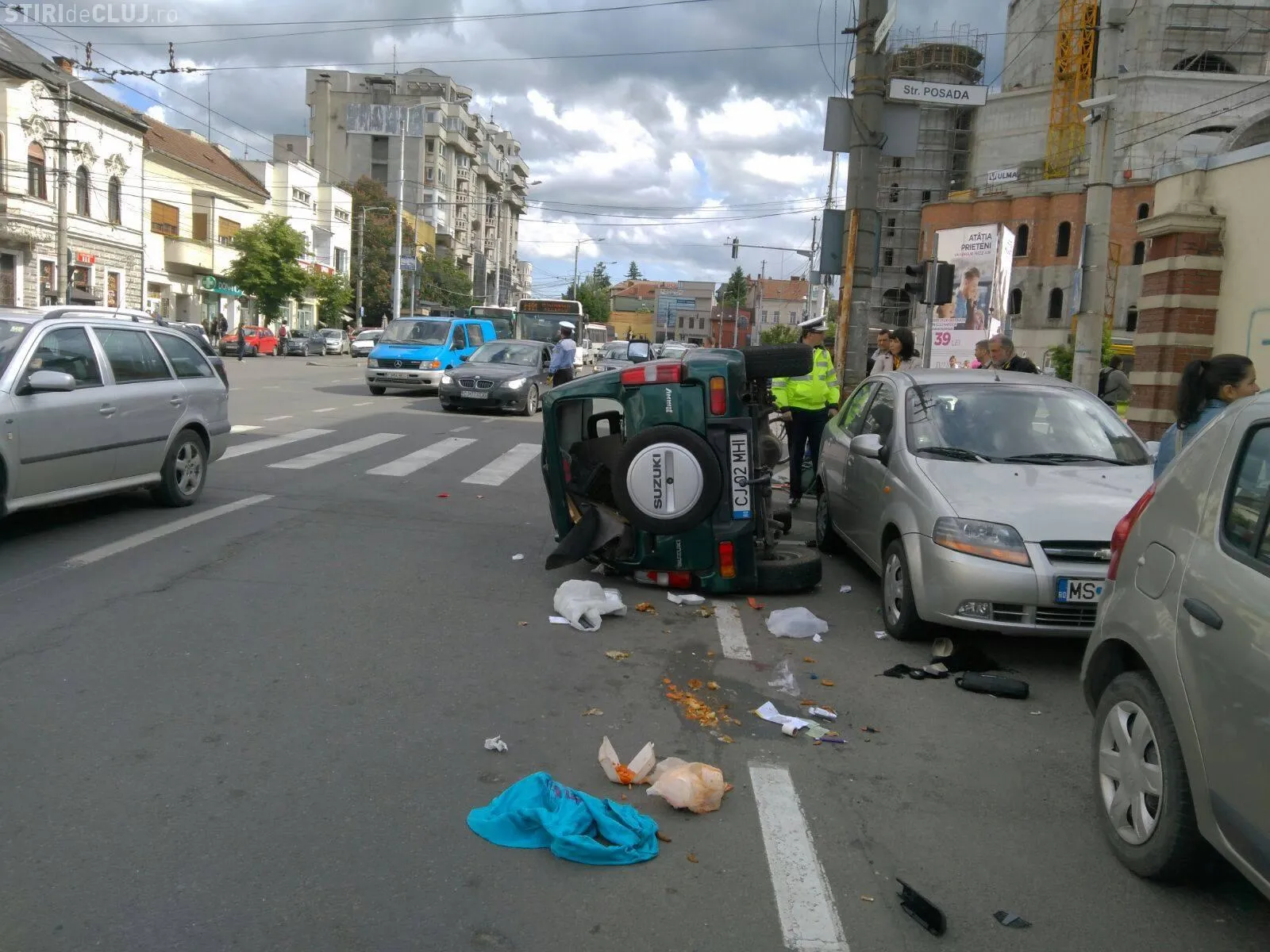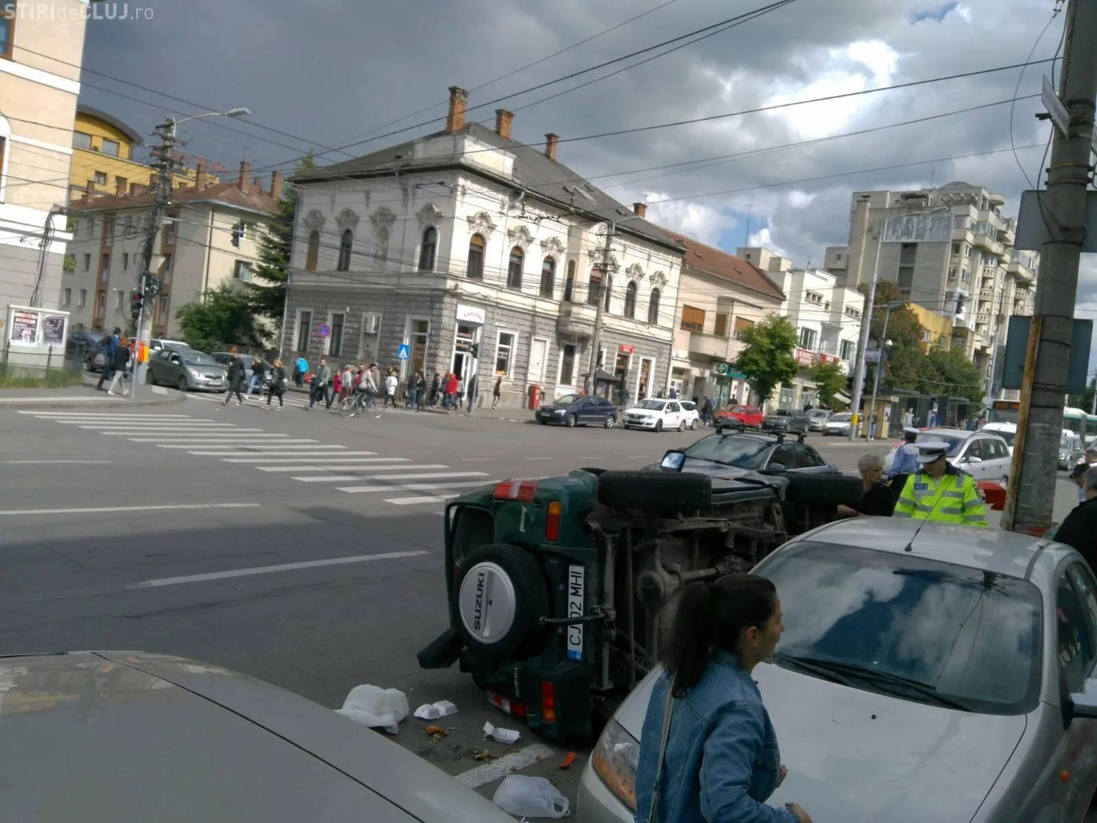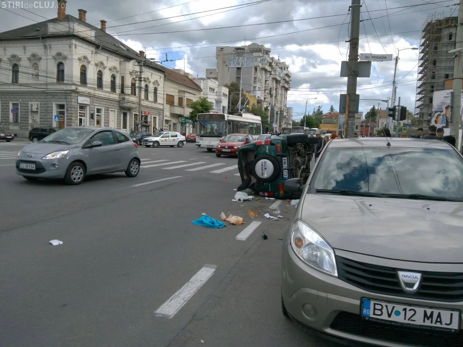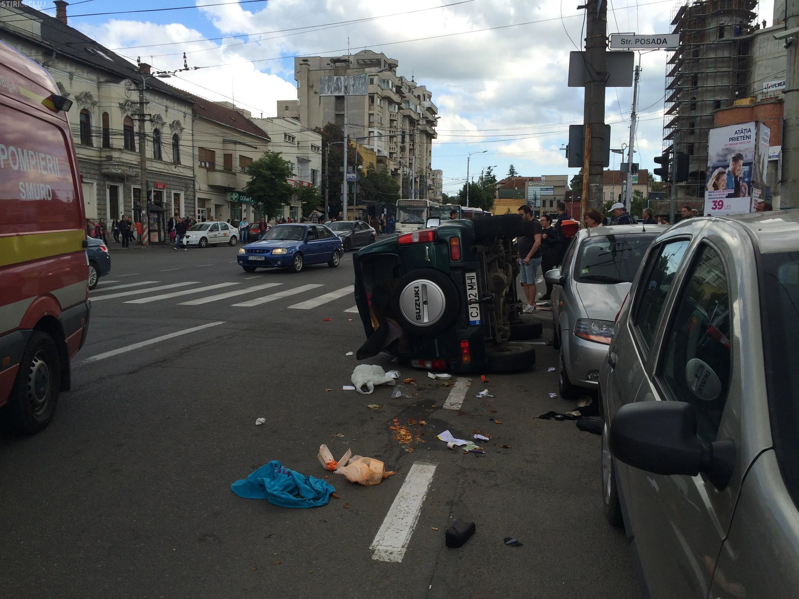 Mașină răsturnată în Piața Cipariu. A lovit și doi pietoni - FOTO