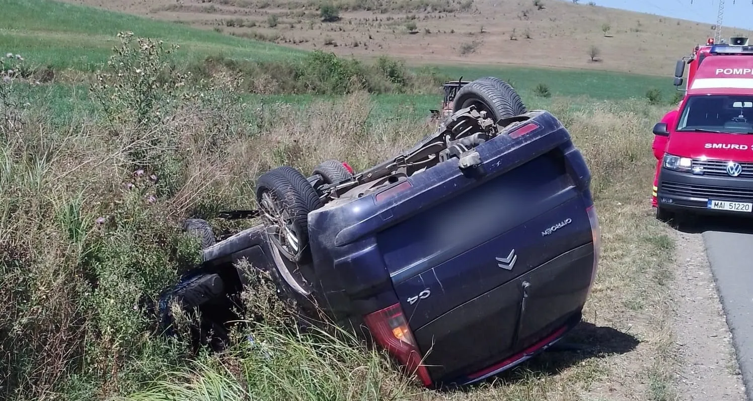 O mașină s-a răsturnat, pasagerii reușind să iasă singuri din vehicul în urma accidentului.