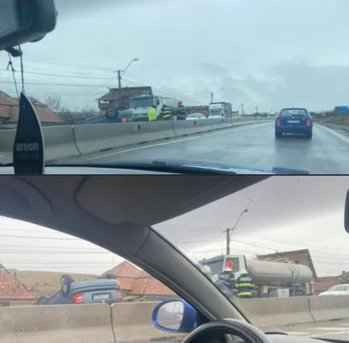 Solicitarea a fost înregistrat în jurul orei 10.30, iar pompierii au găsit la locul intervenției un autoturism răsturnat pe plafon, o autoutilitară avariată și ocupanții erau ieșiți din acestea. O persoană a fost consultată de către echipajul SAJ fără a fi transportată la spital”, a transmis ISU Cluj.