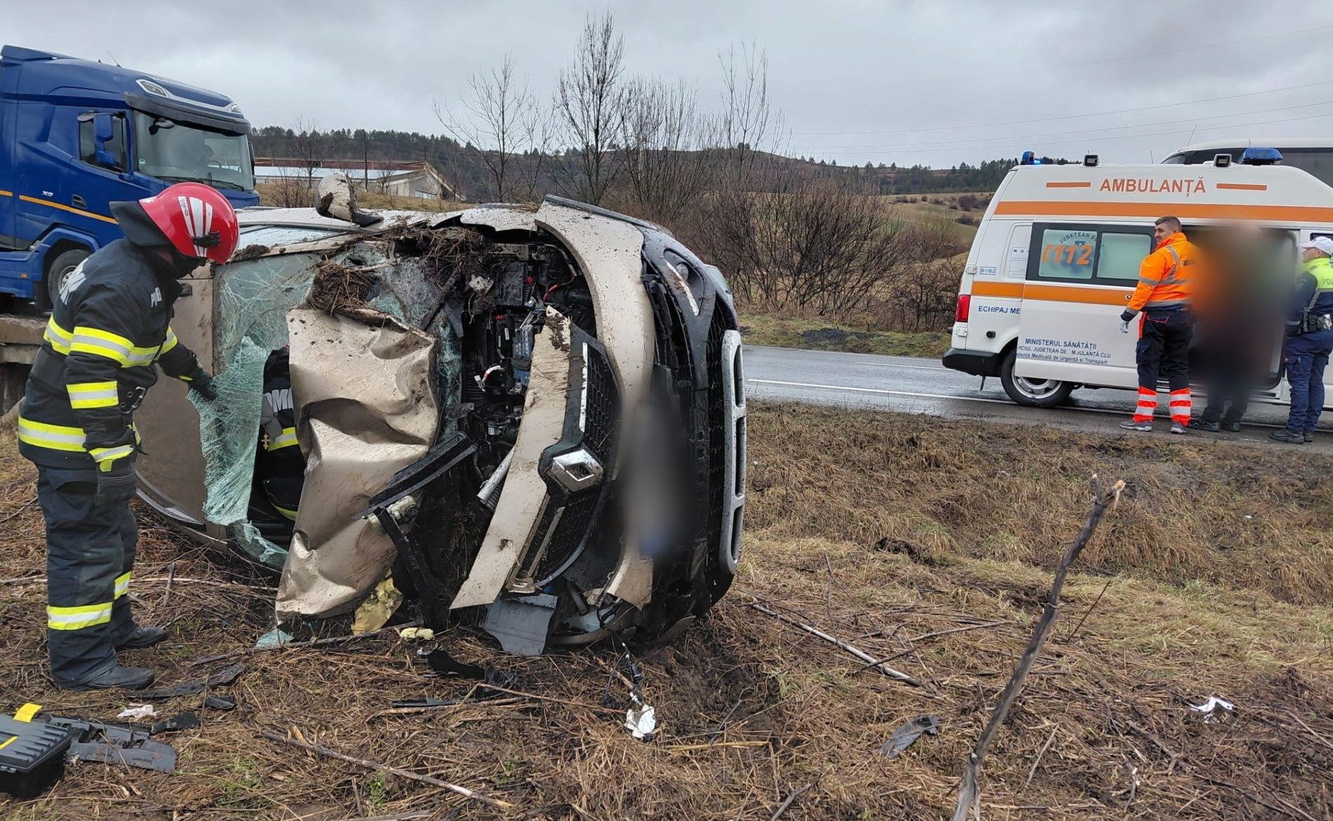Accident cu o mașină răsturnată pe un drum din județul Cluj. La volan se afla o femeie de 45 de ani. Autoturismul a fost avariat puternic