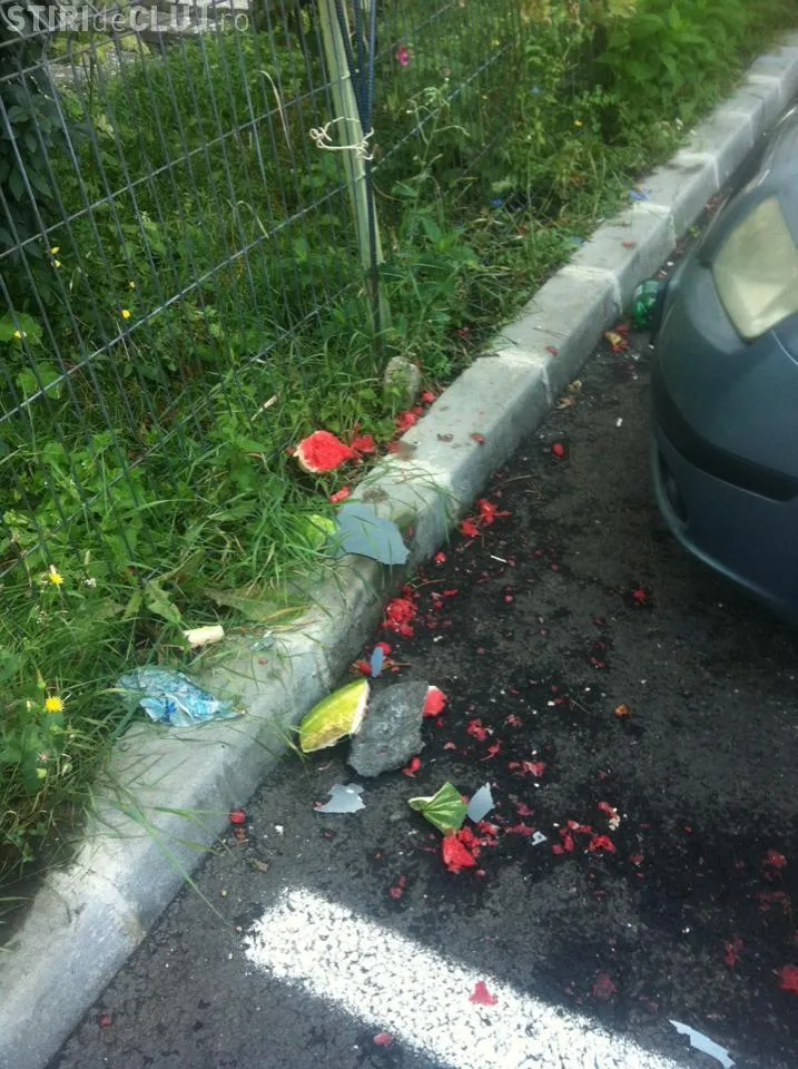 O clujeancă și-a găsit mașina distrusă de un pepene aruncat de cineva de la etajul unui bloc.