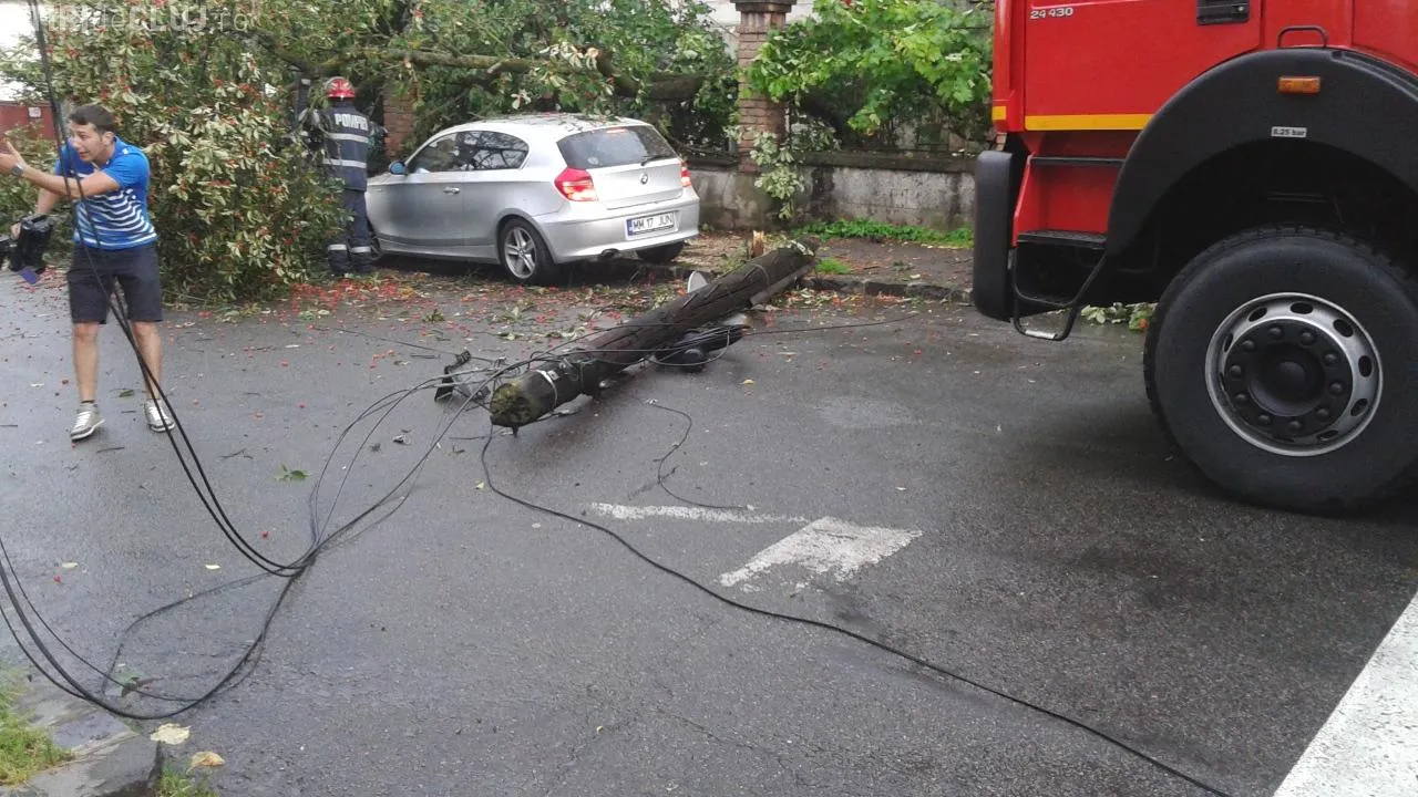 Un incident similar s-a petrecut pe strada Andrei Mureșanu, unde un copac și u stîlp de electricitate au fost doborâți peste o mașină.