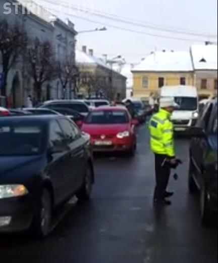 Mașinile parcate ilegal blochează circulația în centrul Clujului, iar polițistul de serviciu stă la taclale VIDEO
