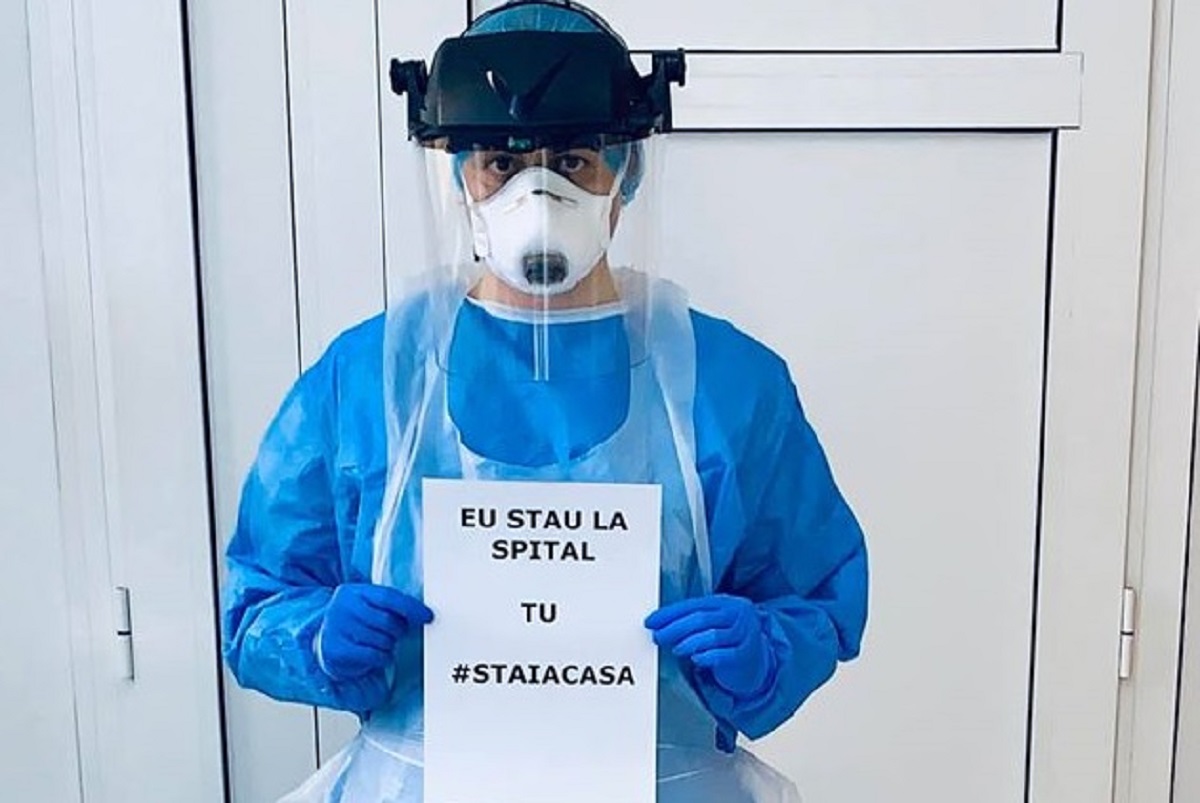 Medicul clujean Teodora Iacob s-a fotografiat îmbrăcată în echipamentul de protecție, având în mâini o coală A4 cu mesajul ”Eu stau la spital. Tu #staiacasa”.