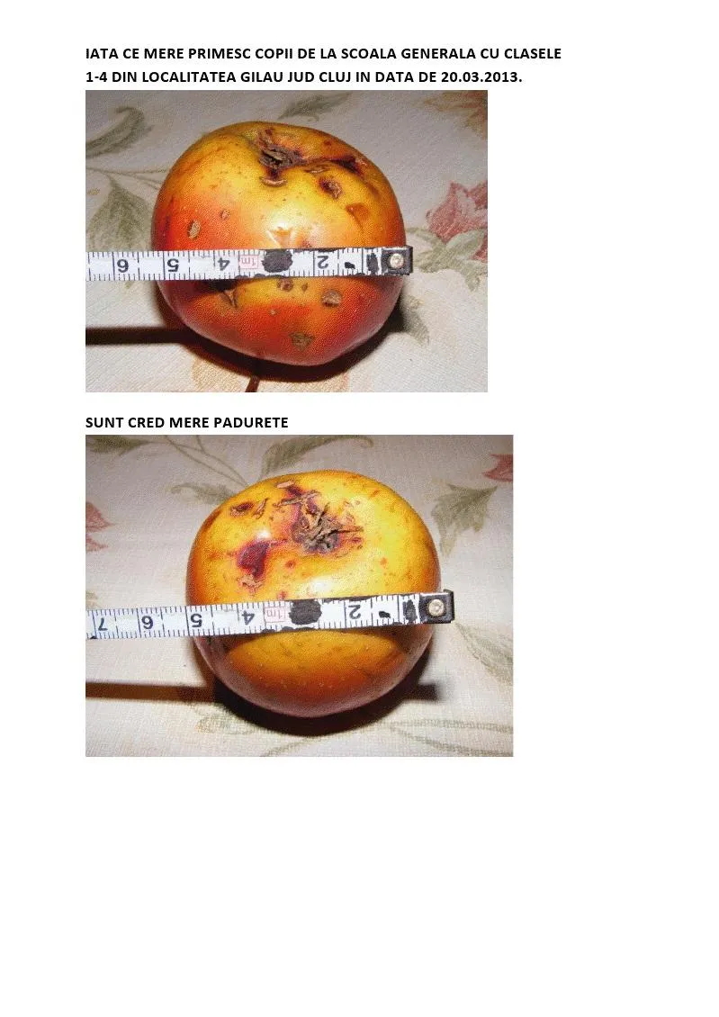Copiii din Gilău au primit la școală mere sub orice critică. Un cititor, care le-a fotografiat și cântărit, crede că sunt mere pădurețe.