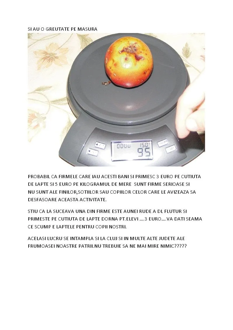 Aceste fructe sunt servite elevilor din clasele I - IV. ”Probabil că firmele care iau acești bani și primesc 3 euro pe cutiuța de lapte și 5 euro pe kilogramul de mere, sunt firme serioase și nu sunt ale finilor, soțiilor sau copiilor celor care le avizează să desfășoare această activitate”, susține Daniel Vieru, cel care a cântărit și măsurat merele.