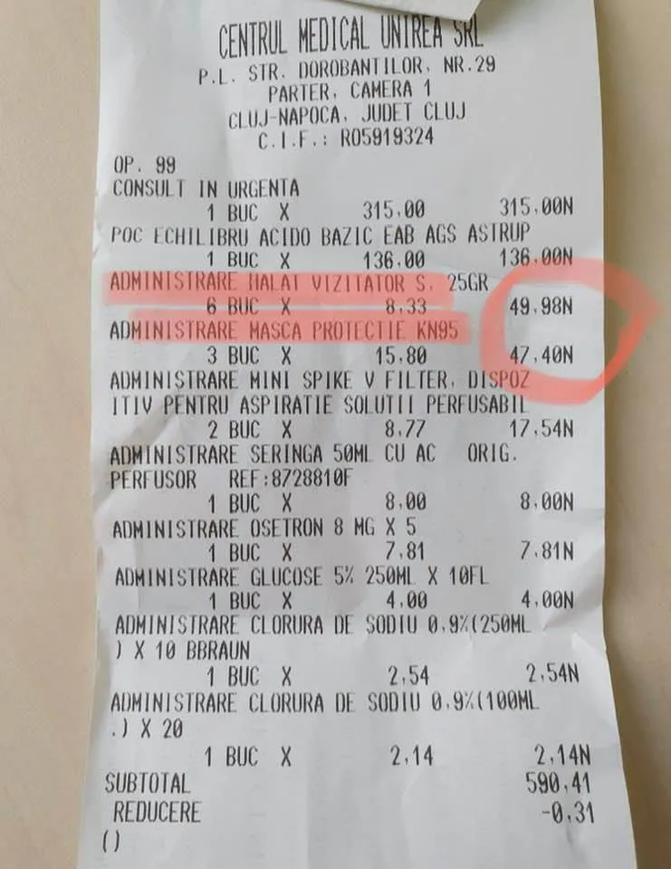 ”Știați că dacă mergeți la un spital privat pentru un consult puteți ajunge ca, pe lângă consultație, să plătiți masca și halatul doctorului? Și al celor două asistente? Halate chiar două bucăți de persoană! Prietena mea, care a mers cu copilul la Centrul Medical Unirea din Cluj, a aflat asta abia de pe bon. Eu sunt uimită și scârbită de modul în care i-a fost umflată nota de plată cu o sută de lei…”, a relatat o apropiată a mămicii în cauză.